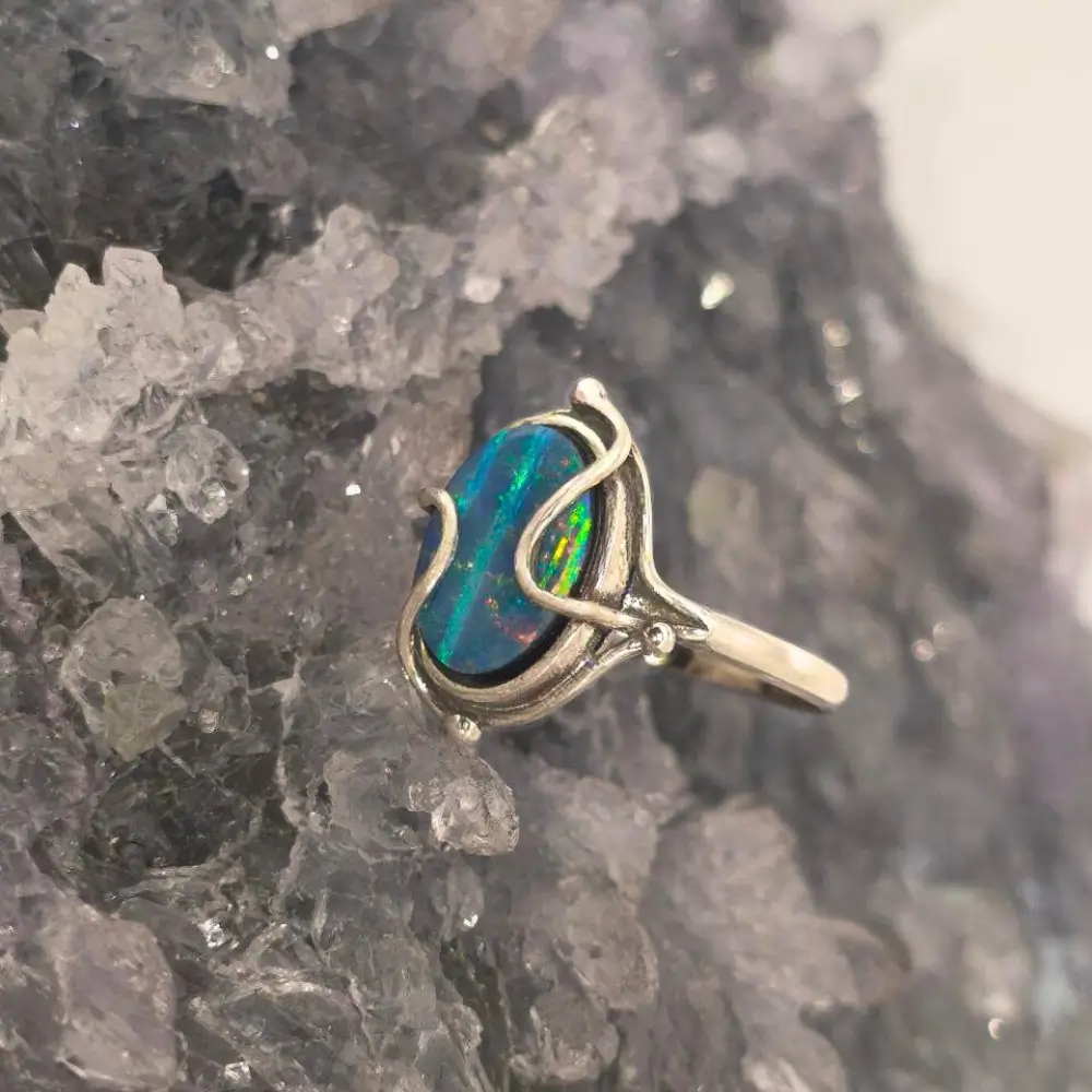 This exquisite Lightning Ridge Doublet opal ring, set in polished S925 Silver, is a celebration of colour, light, and delicate strength. Weighing 0.6g (3.00 ct) oval opal, it reveals soft, shifting flashes of blue, green, gold, orange, and pink across its low-dome surface. With an N4 bodytone and B3 brightness, the opal’s vibrant hues dance in everyday light, drawing the eye and capturing attention effortlessly. Designed for US size 12, the ring is non-adjustable yet comfortable, allowing its luminous presence to float gracefully on the wearer’s hand.