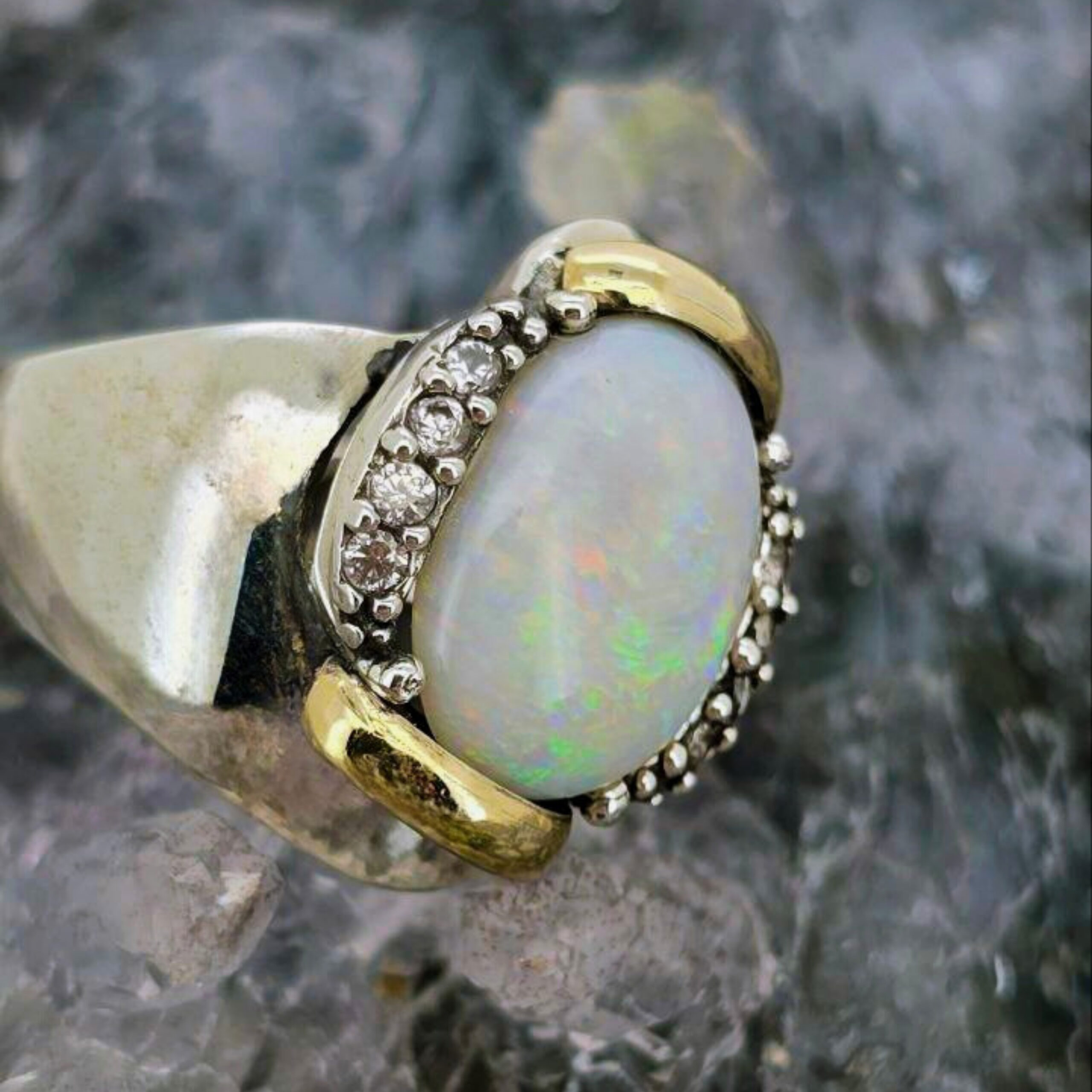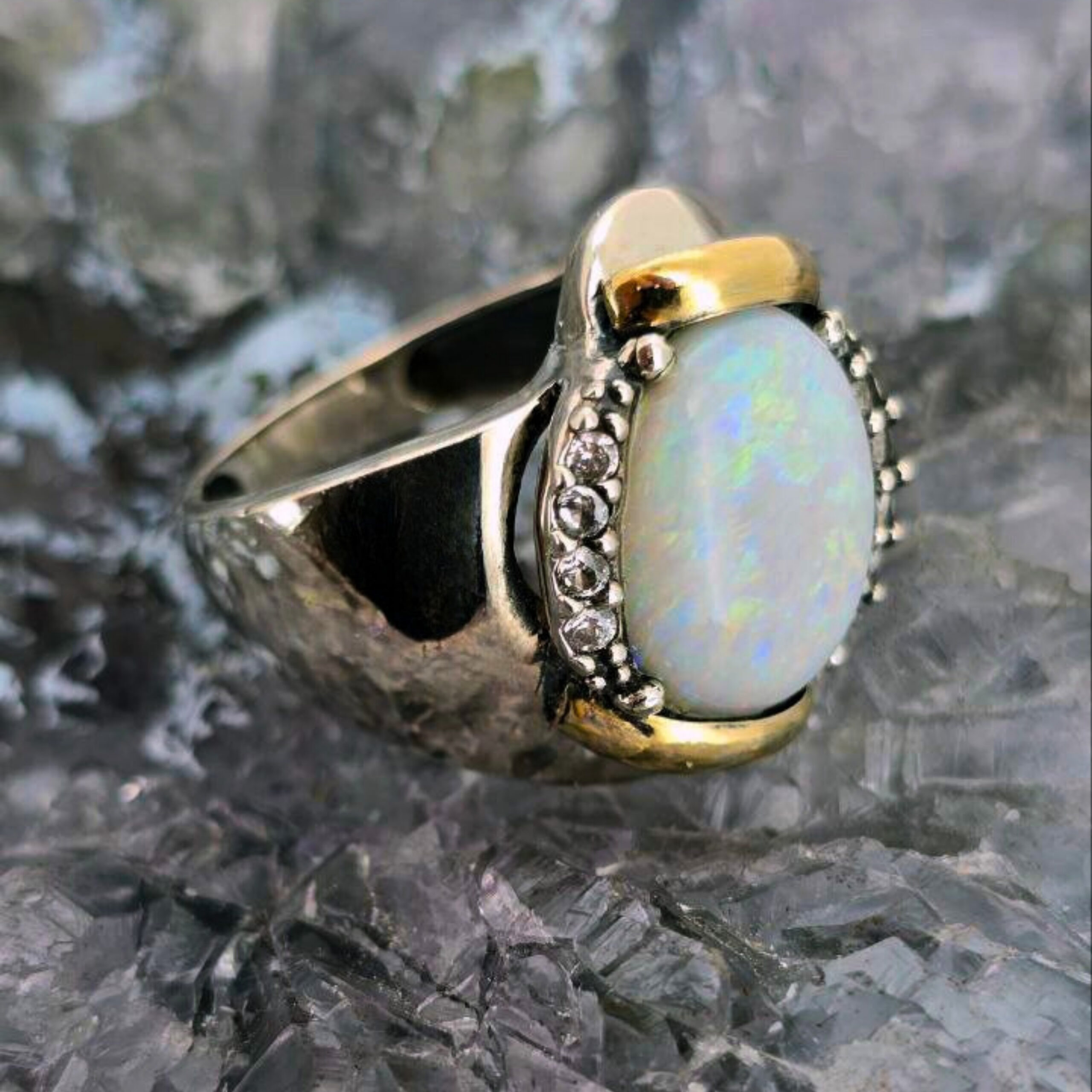 There comes a moment in every woman’s story when she no longer seeks to shine for the world — but to reflect the light she’s found within. This ring was made for that moment. At the center, a natural 2.50ct White Opal from Coober Pedy glows with ethereal fire — the stone alive with shifting hues of Blue, Green, Orange, Gold, Pink and Red. A milky white N7 bodytone softens the palette, allowing each colour to bloom with quiet elegance while radiating with (B3) brilliant intensity, it captures and reflects even the subtlest light. It holds the kind of beauty that doesn’t demand attention, but draws it effortlessly. The oval gem is set in polished S925 Silver, elevated with 14K gold and CZ accents — a union of contrast and harmony. Fine CZ stones glint like small victories along the way, adding a touch of light to every gesture. More than ornament, it is a quiet punctuation in her journey — a symbol of something chosen, something complete. Crafted for you in US 6, harmoniously matched to AU L+1⁄2 .