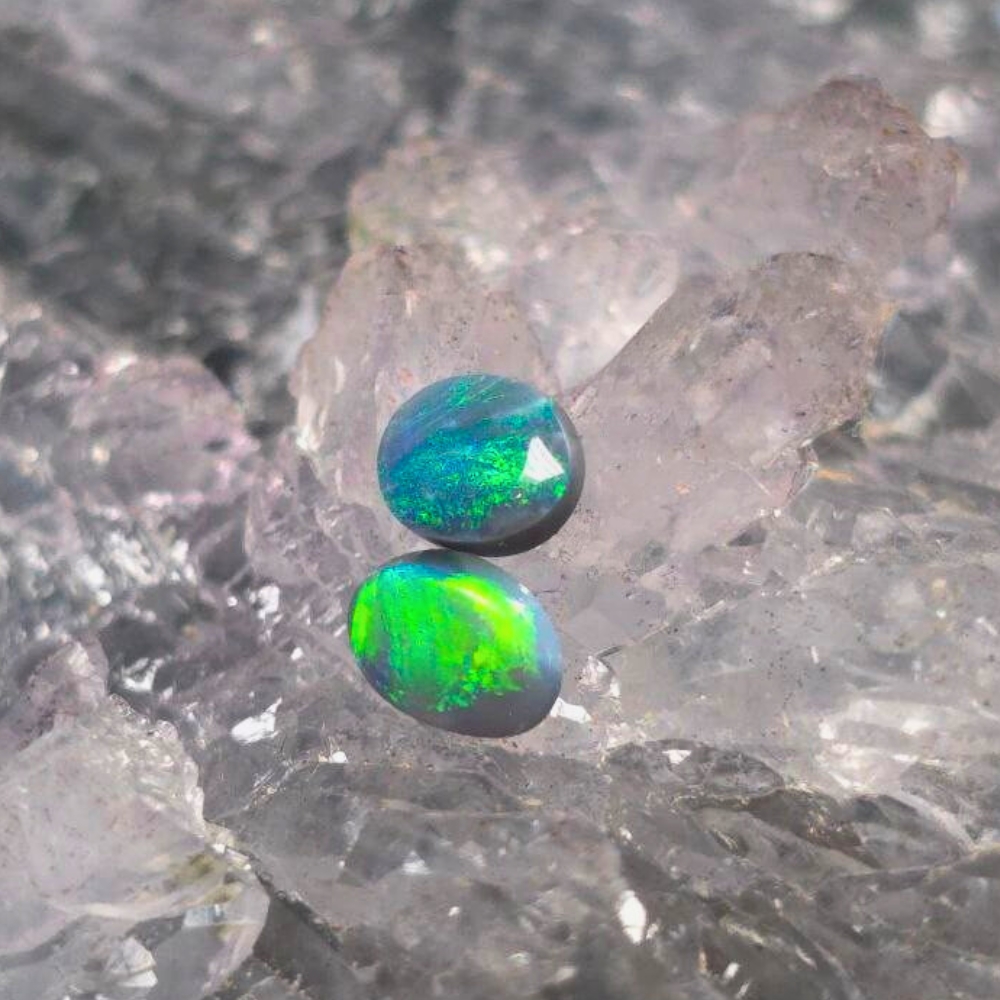 Ashira & Lirael are a matched pair of 0.50ct Black Opals from the depths of Lightning Ridge—subtle, soulful, and full of quiet fire. With a deep N4 bodytone and soft B2 brightness, colours of blue and green glow gently but captivating, like starlight veiled in dusk. Ashira, meaning “I will sing” in Hebrew, carries a lyrical energy—an inner light that hums softly beneath the surface. Lirael, inspired by fantasy and forgotten knowledge, holds a shadowed grace, pulling you in like a whispered secret.