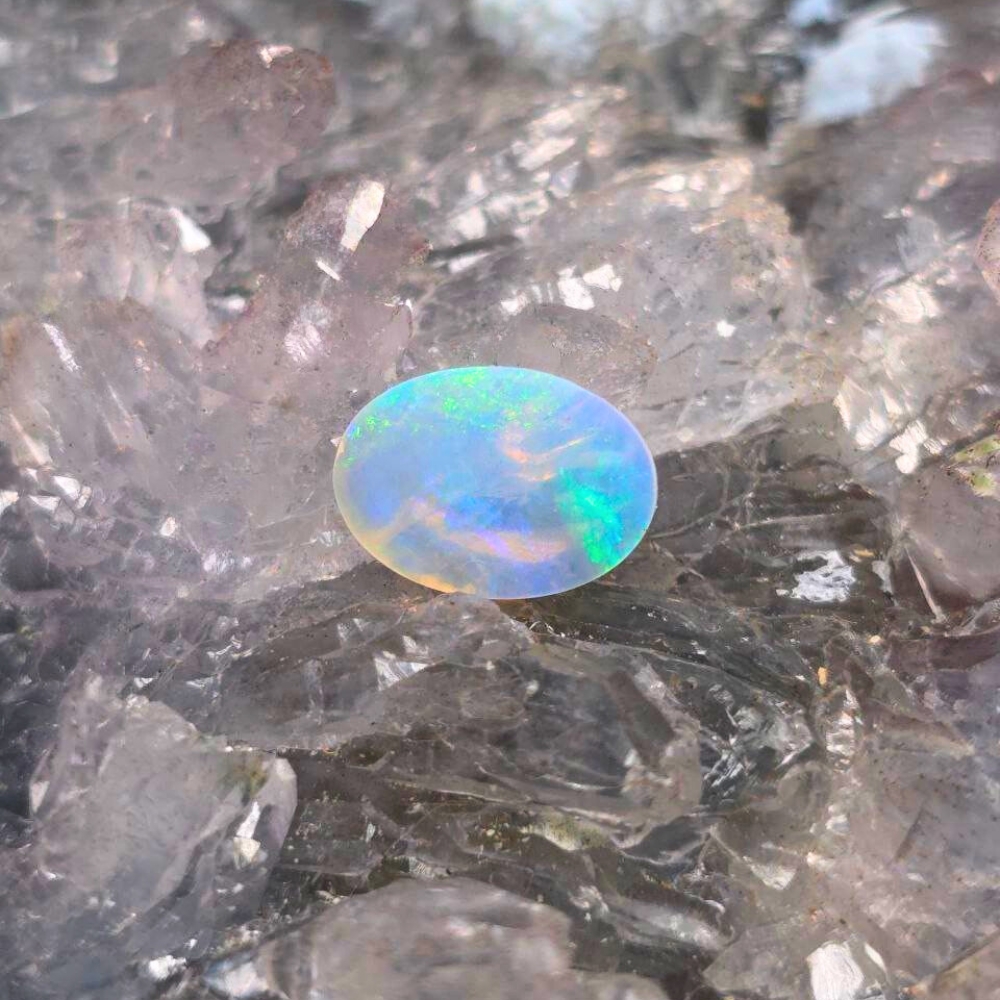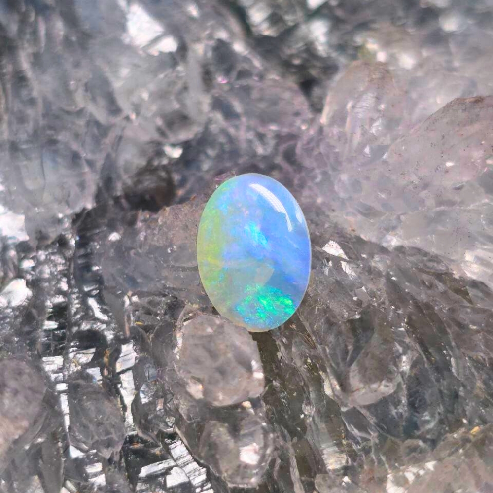 From the depths of Lightning Ridge comes Clair Vivara, a 0.90ct Crystal Opal alive with gentle brilliance. Polished into an elegant oval, it glows with a soft B2 brightness against the deep contrast of its N8 bodytone. Across its surface, a luminous dance of blue, green, orange, and gold unfolds—like light caught in motion. Together, “Clair Vivara” conjures an image of a radiant, lively gemstone that reflects clarity, light, and vibrancy—perfect for an opal with shifting hues and an ethereal presence. “Clair” reflects clarity of vision and thought, while “Vivara” evokes a spirit that is alive, curious, and ever-shifting—just like the play of colour it holds. Worn close, it becomes a mirror of the wearer’s evolution: subtle yet radiant, calm yet full of life. This opal is for the soul who carries quiet strength and vibrant depth.