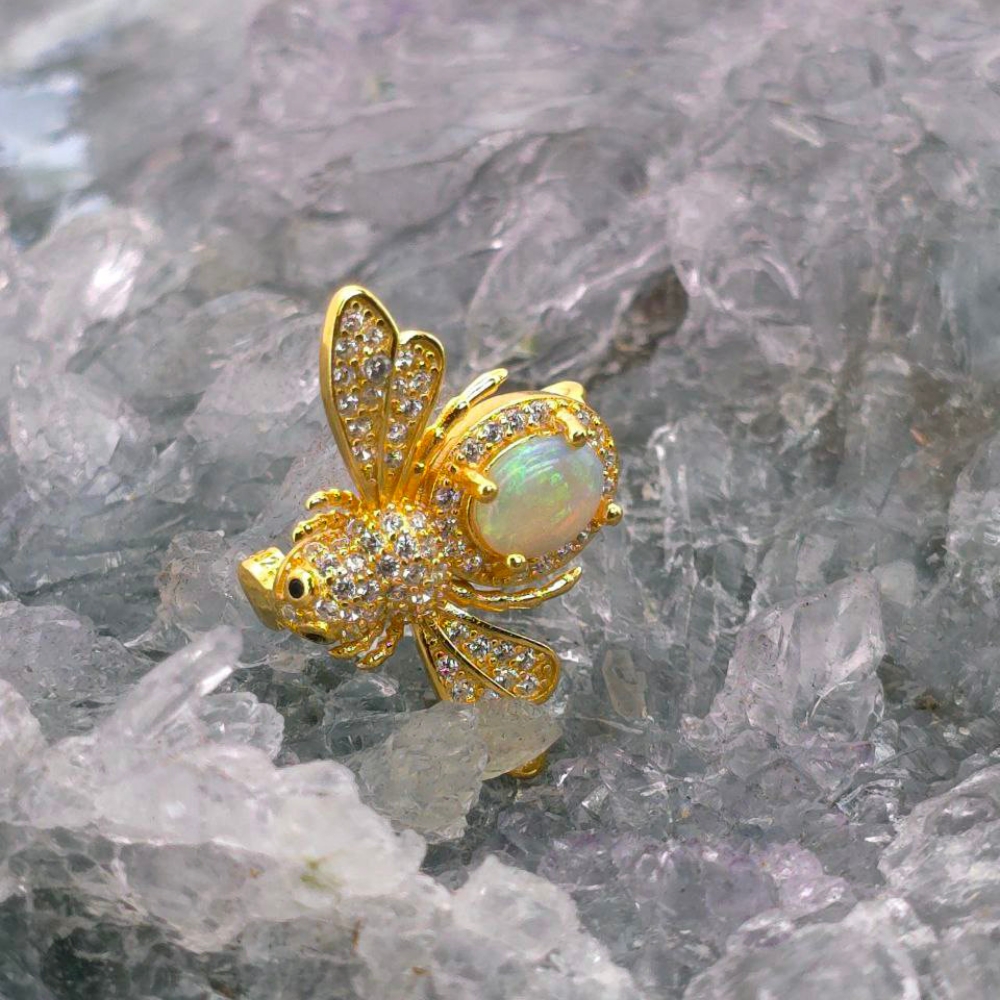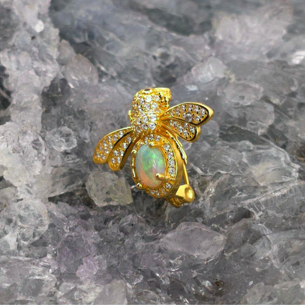 Inspired by the heart of nature’s hardest worker — the gatherer, the pollinator, the quiet foundation of every bloom — this brooch symbolizes the woman who does the same: she collects beauty, spreads kindness, and nurtures growth in every space she enters. With rich flashes of gold, orange, and green, this opal glows like sunlight through a forest canopy. Purple and blue glisten like dusk above flowering fields. It mirrors the soul of someone who: