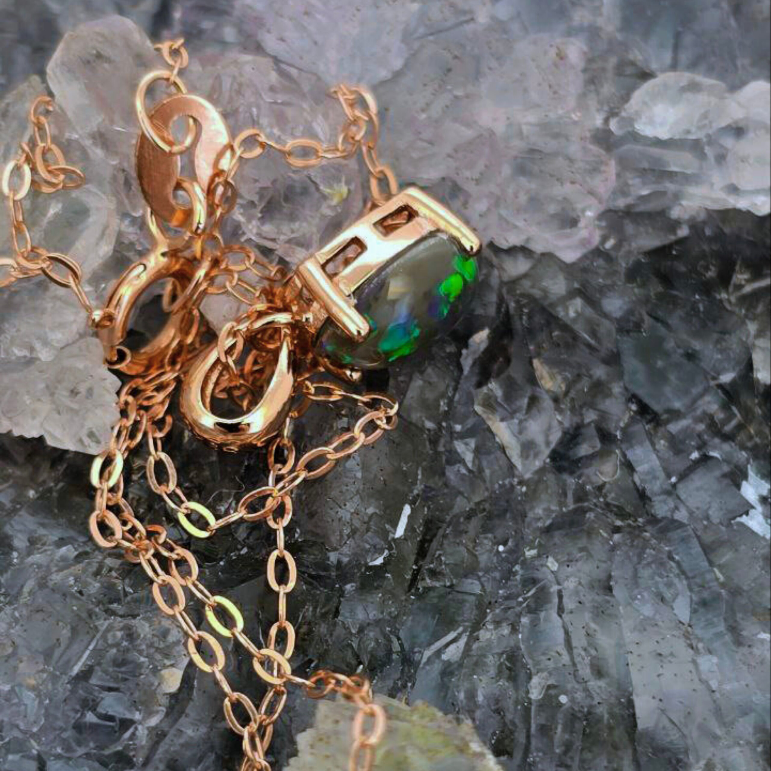 From the heart of shadow and starlight comes Dramelune Vélaire — a necklace that holds the quiet theatre of night in its polished depths. This 0.70ct freeform Black Opal, born in the ancient fires of Lightning Ridge, carries a secret song in its depths: a dance of blue and green flames that flicker like whispered dreams beneath a dark velvet sky. Its rich N4 bodytone enfolds bursts of shimmering colour—like auroras caught in a glass cocoon—while the B2 brightness breathes life into every shimmer, making the stone pulse with an inner glow only visible to the attentive eye. It draws the gaze but reveals its full magic only to those who look closely. Framed by Rosegold-plated 925 Silver, the necklace balances strength and softness, much like the woman who wears it. Against the skin, the cool metal contrasts with the warm fire beneath, creating a tension — a story — on the neckline.