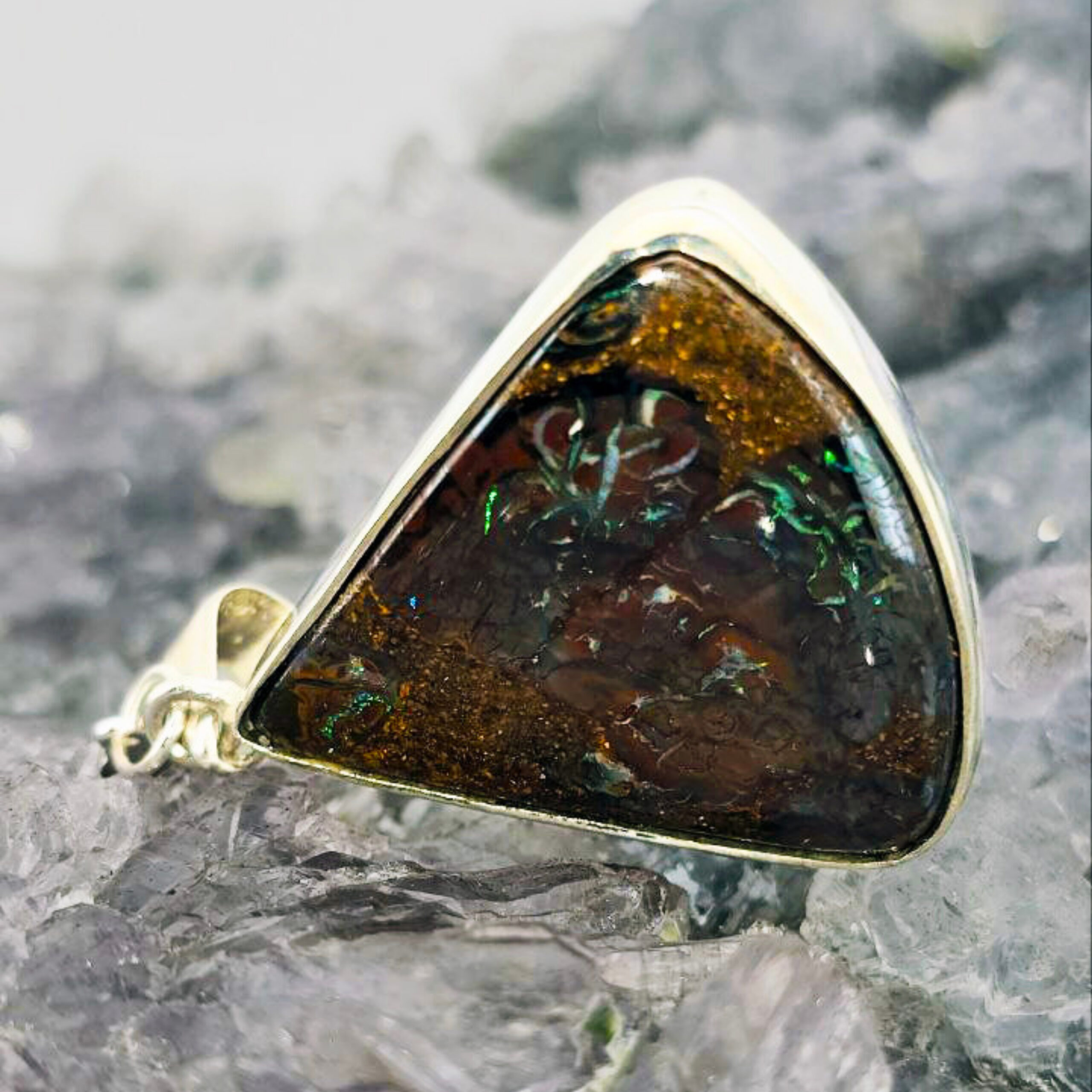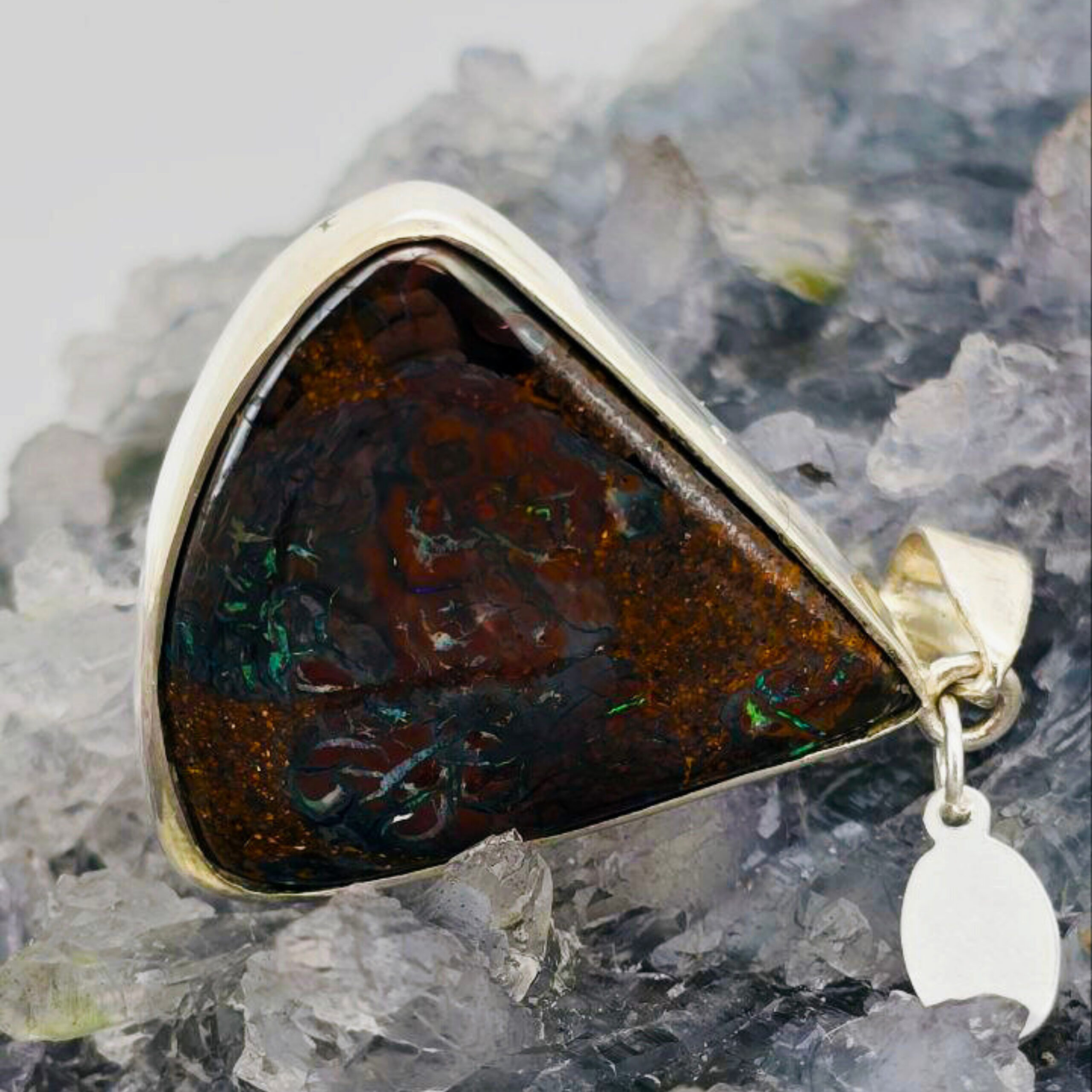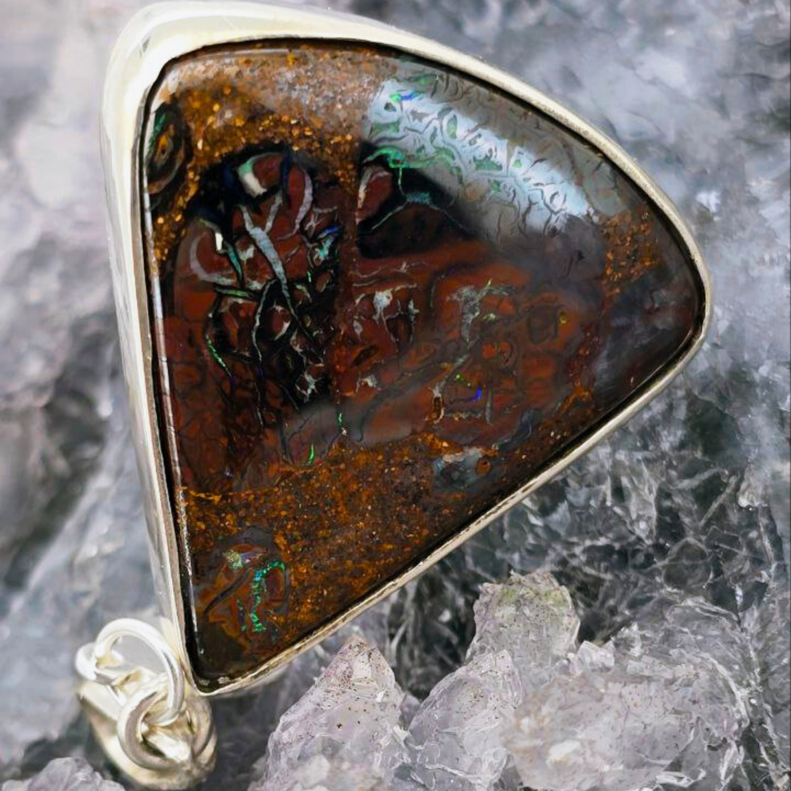 Freedom’s Flame is a bold emblem of awakening—a fire kindled in stone, forever burning. Cut in a striking triangular form and alive with B1 brilliance, this Queensland 30.00ct Boulder opal ignites with vivid flashes of blue, green, orange, gold, and purple. Set in polished Sterling Silver, its luminous blaze shifts with every turn, echoing the wild beauty of untamed spirit. Freedom’s Flame is for the one who carries fire in her soul and courage in her step. It honors the journey of liberation—through fear, through shadow, into light. To wear it is to embody a fierce grace, to rise each day with intention, and to never forget the power of your own becoming.