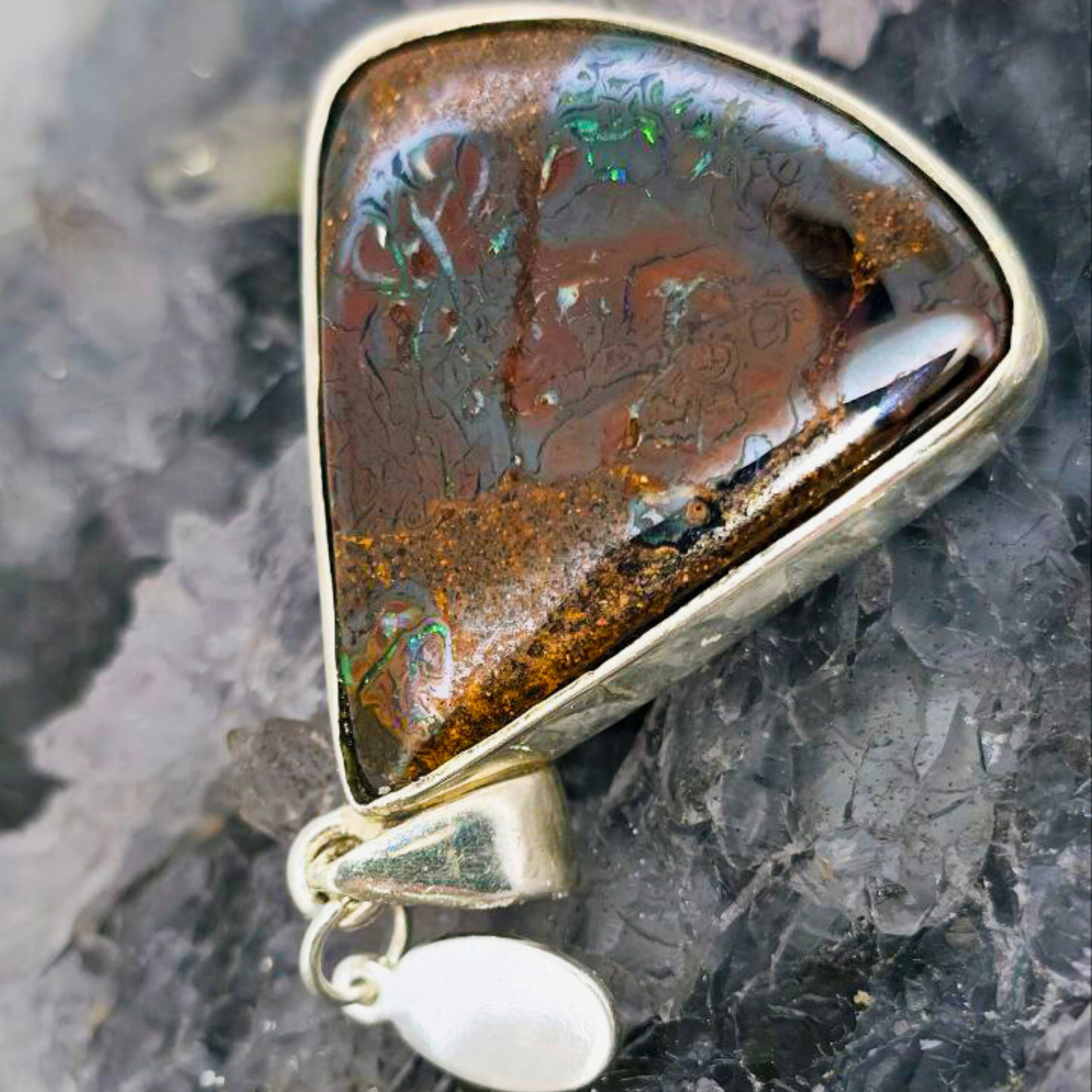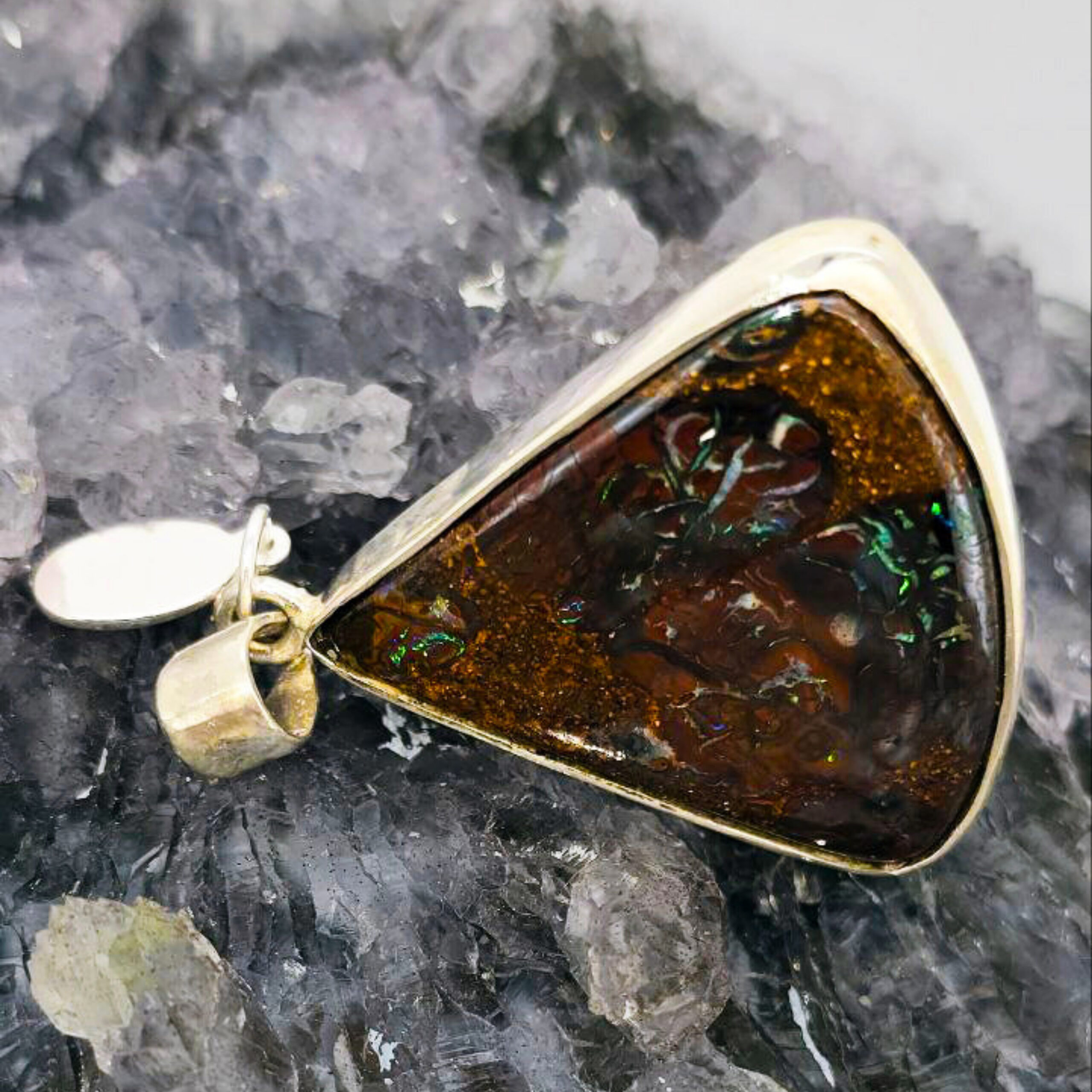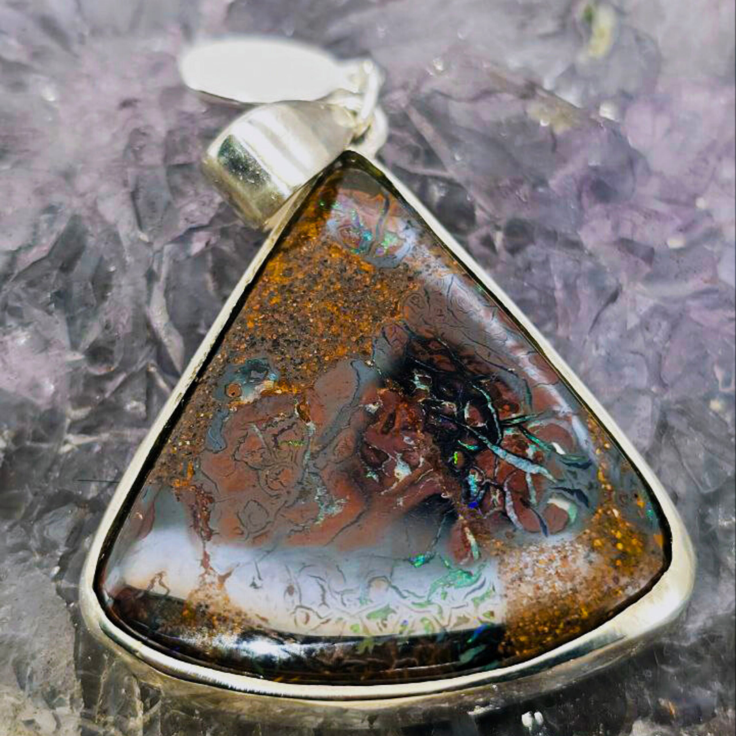Freedom’s Flame is a bold emblem of awakening—a fire kindled in stone, forever burning. Cut in a striking triangular form and alive with B1 brilliance, this Queensland 30.00ct Boulder opal ignites with vivid flashes of blue, green, orange, gold, and purple. Set in polished Sterling Silver, its luminous blaze shifts with every turn, echoing the wild beauty of untamed spirit. Freedom’s Flame is for the one who carries fire in her soul and courage in her step. It honors the journey of liberation—through fear, through shadow, into light. To wear it is to embody a fierce grace, to rise each day with intention, and to never forget the power of your own becoming.