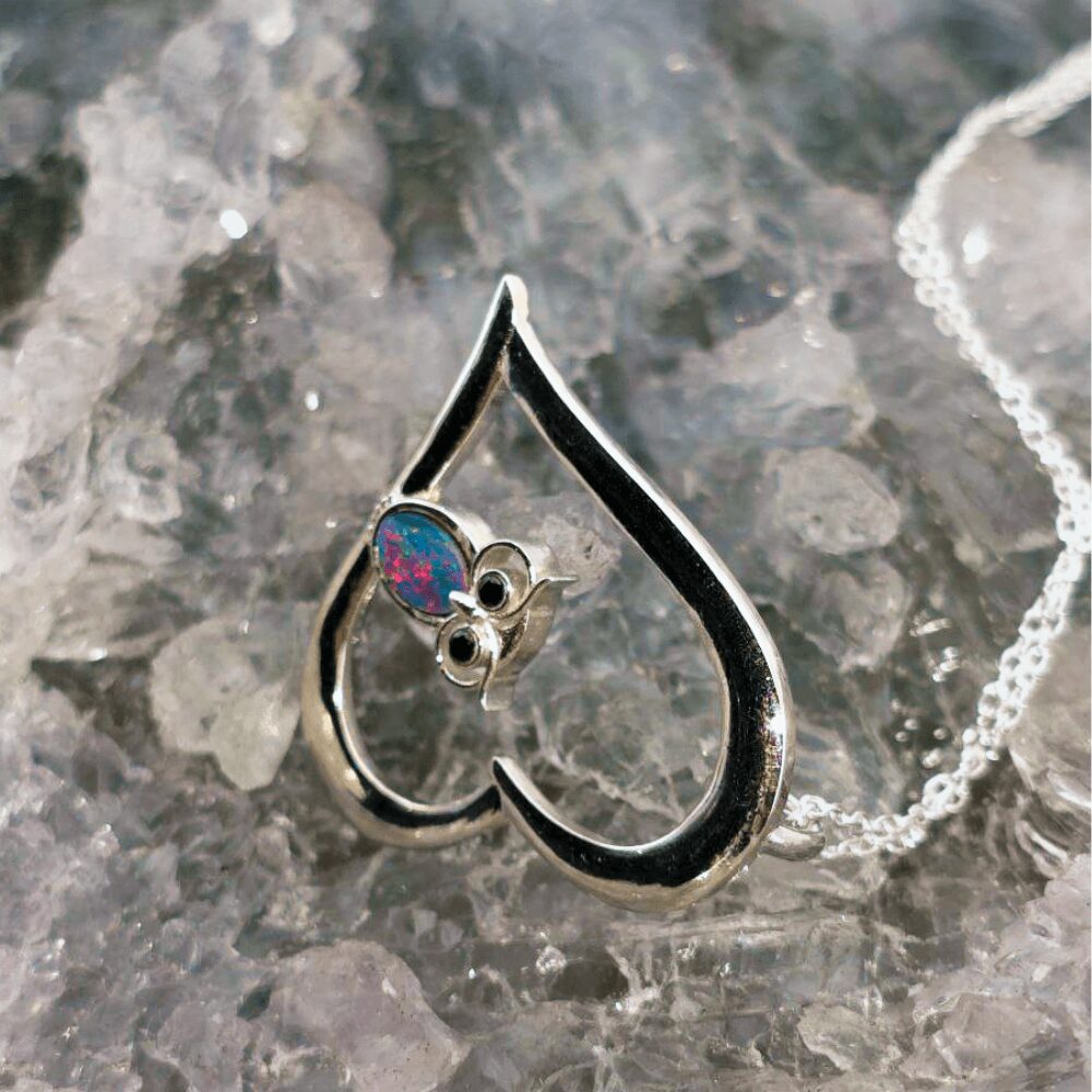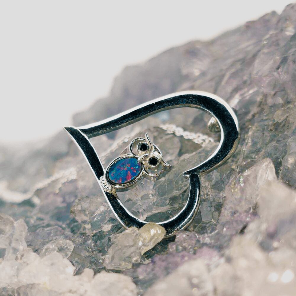“Hedwig” Owl Doublet Opal Pendant — A graceful 0.16g Australian Doublet Opal necklace from the world-renowned Lightning Ridge, set in elegant S925 silver. With its N4 bodytone and B3 brightness, this captivating gem reveals a stunning interplay of blue, green, orange, gold, pink, and red — shimmering like a twilight sky. For an owl-shaped doublet opal pendant — symbolic of wisdom, intuition, and quiet strength — the 46 cm length creates a poised presentation. It frames the neckline elegantly while allowing the opal’s shifting hues to glow with subtle mystique. The Hedwig necklace embodies charm and sophistication, making it a perfect statement of elegance and Australian opal magic.