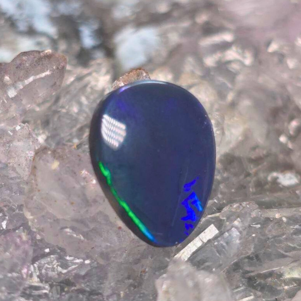 Ignara evokes hidden embers—an untamed, ancient fire that smolders quietly, yet intensely. Umbrael calls forth celestial shadow, the divine mystery found only in the deepest night. Together, Ignara Umbrael becomes a name for a 3.25 ct Lightning Ridge Black Opal that holds both fierce inner light and dark serenity. With an N3 bodytone and B2 brightness, this opal reveals deep hues of blue and green, dancing like flame beneath a smoky veil. Its teardrop shape flows like molten shadow, polished to a mirror-like finish that accentuates its natural depth. Mined from the legendary soils of Lightning Ridge, this solid black opal is not only rare, but commanding—perfect for those who walk the line between mystery and power.