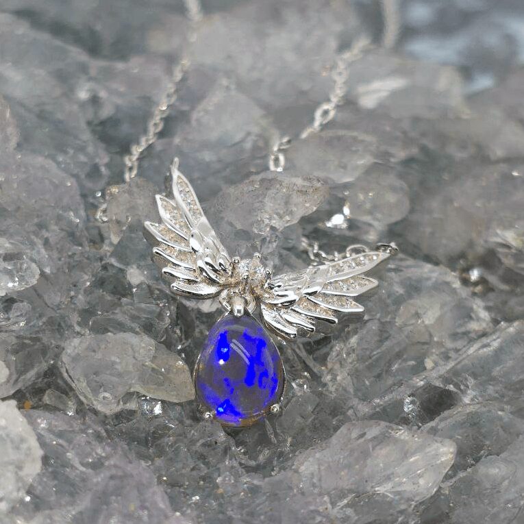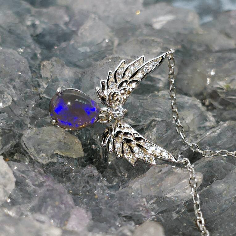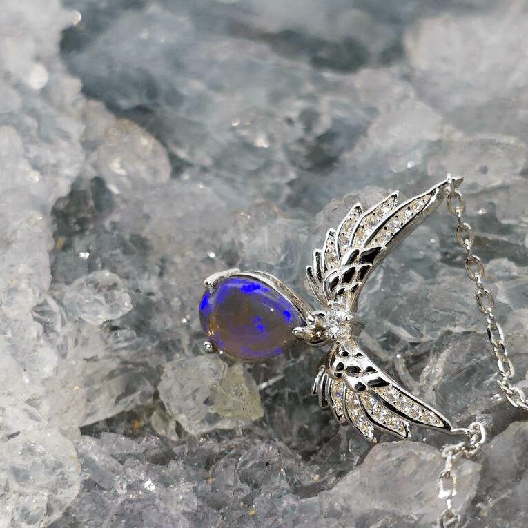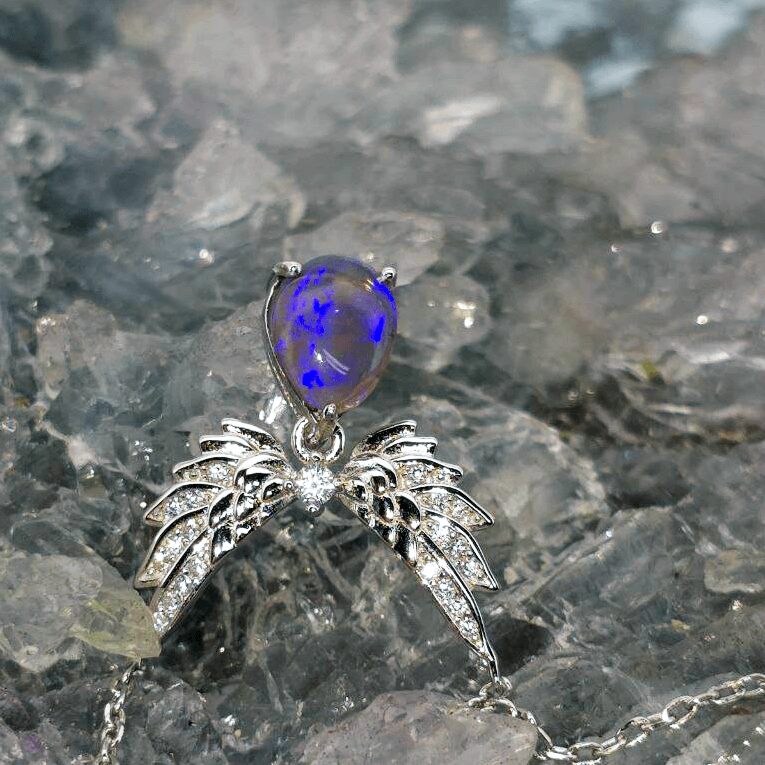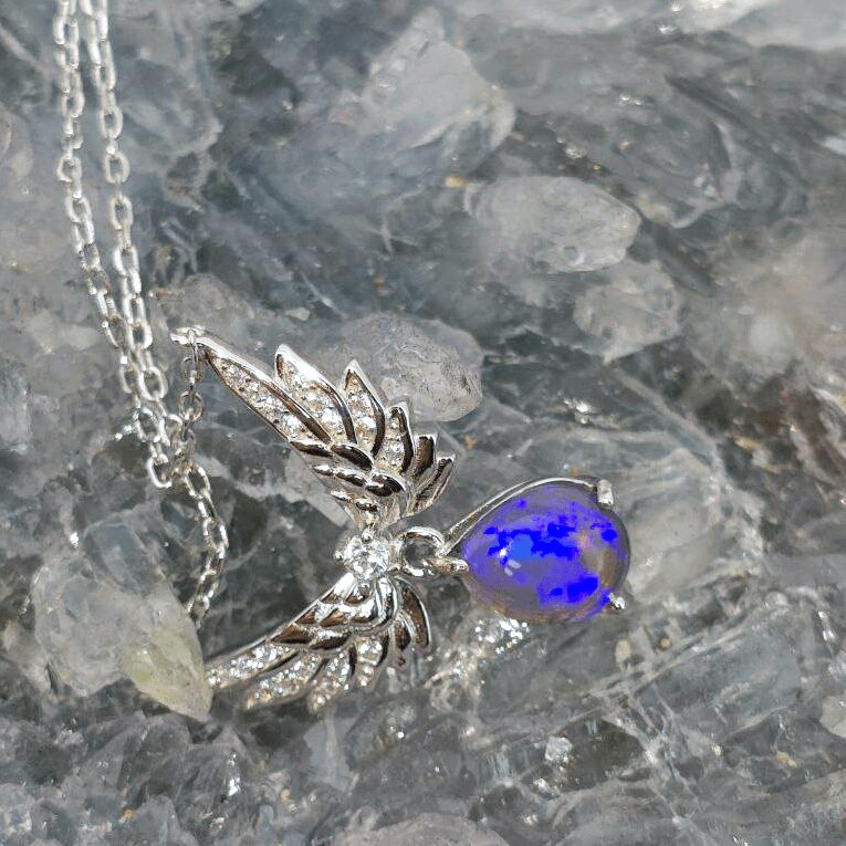 Bathed in light and shadow, Iridesca holds the mystique of Lightning Ridge within a graceful teardrop. This 1.00ct dark crystal opal, measuring approximately 8.5 x 6.5 x 2.2 mm, rests in solid S925 sterling silver on a 40 cm + 5 cm chain. Polished to a medium dome with N5 bodytone and of moderate brilliance, it radiates a captivating play of purple fire — a colour long associated with intuition, imagination, and inner strength.