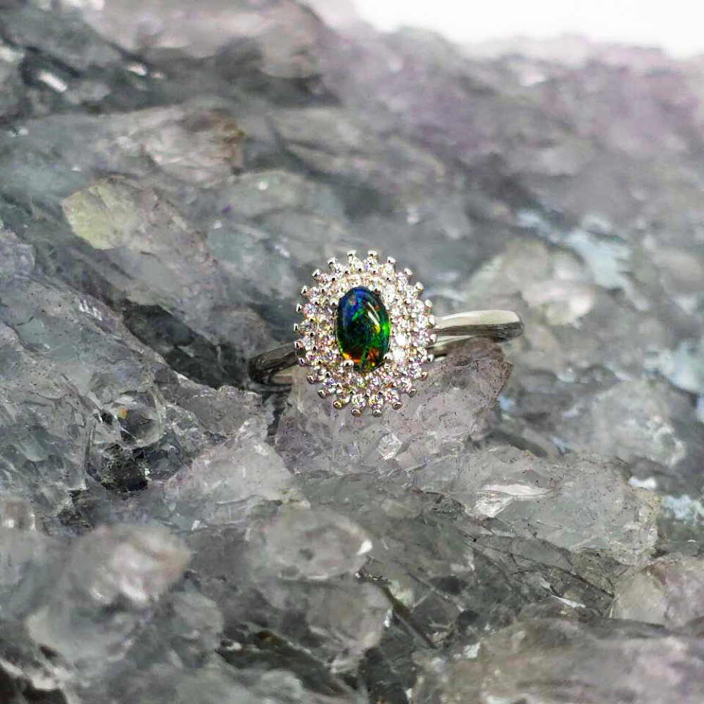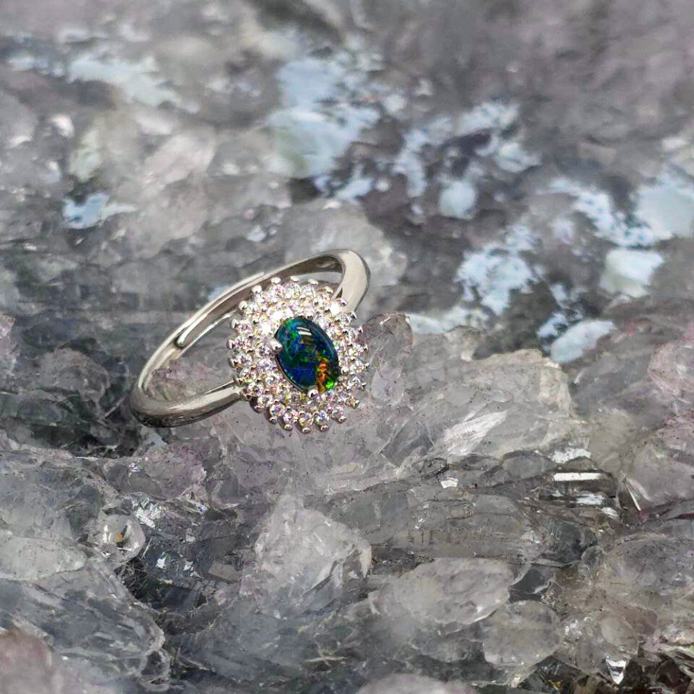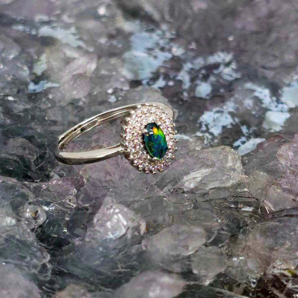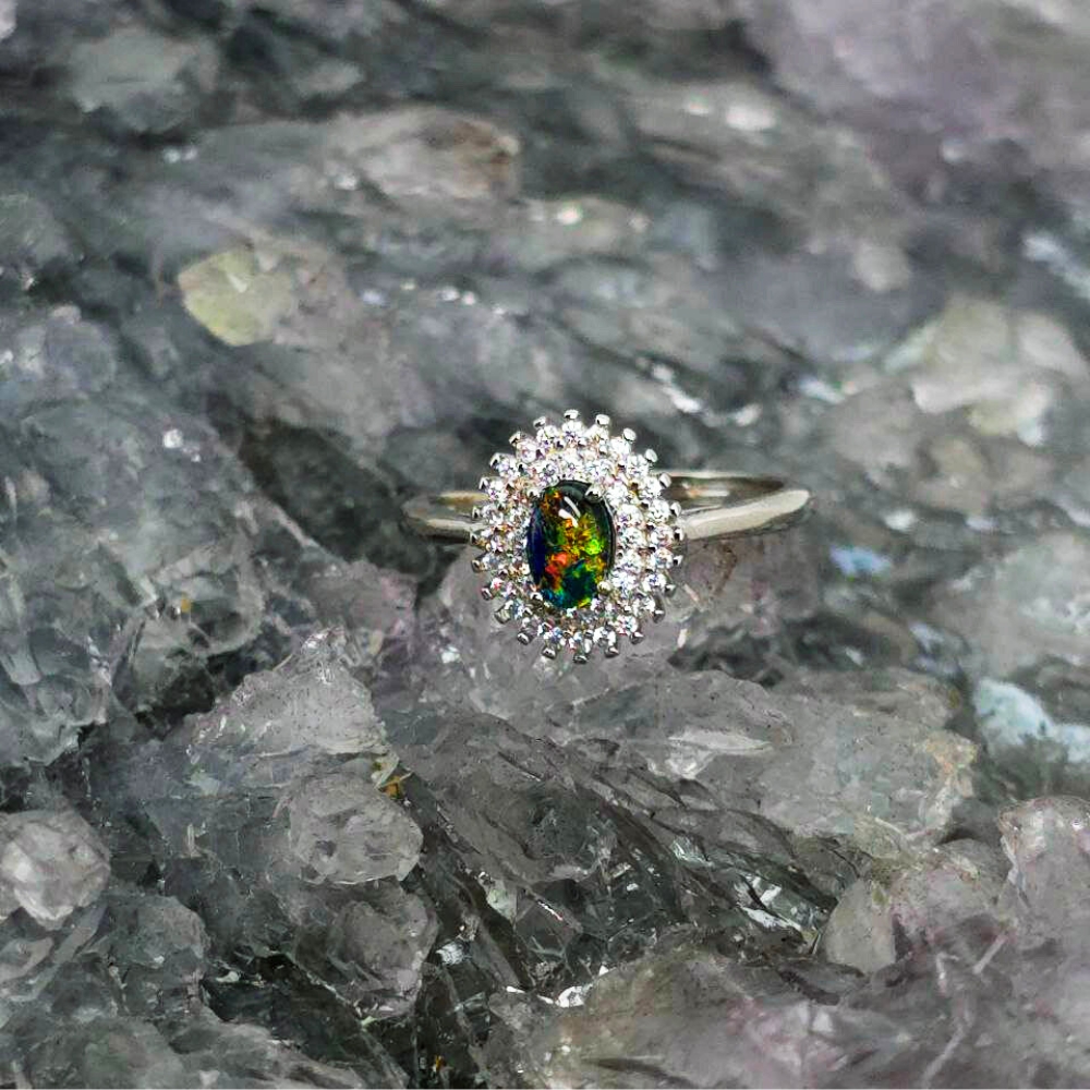 Where softness meets fire, the Isabeau ring carries a name steeped in regal strength and quiet rebellion. Isabeau suggests both beauty and defiance — a woman who lives between worlds: soft and sovereign, graceful and unyielding. At its heart lies a Lightning Ridge Triplet opal, polished to bring forth its deep inner radiance. Encased in S925 Sterling Silver, this oval-cut stone burns with layers of blue, green, orange, gold, pink, and red — colours that shift like truth in motion, vibrant but never loud. Its N2 bodytone gives a near-black depth, a dramatic canvas that enhances every flicker of flame within. The B3 brightness ensures a luminous presence without overwhelming—inviting you closer rather than demanding to be seen.