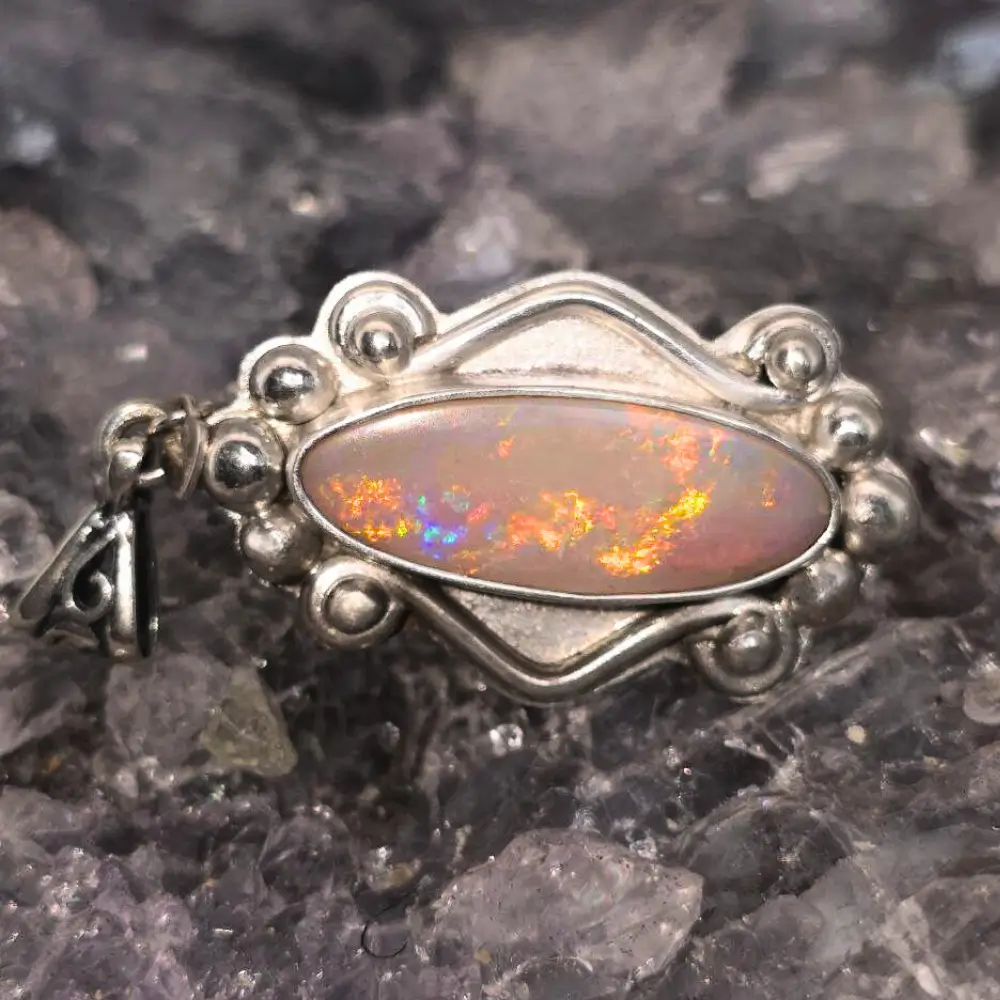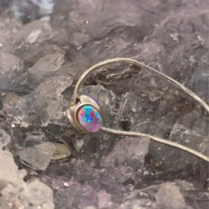 In the heart of the ancient earth of Coober Pedy, whispers of colours lie waiting to be discovered. Learni awakens these whispers—a crystal opal, handcrafted in 925 sterling silver, its polished oval surface alive with flickers of blue, green, pink, red, orange, and gold. Each shimmer is a note in a silent melody, a fleeting vision of light caught between past and present. Though newly made by skilled hands, this pendant carries the aura of something timeless, an exquisite gem of wonder, curiosity, and transformation, ready to accompany its wearer into their own unfolding story.
