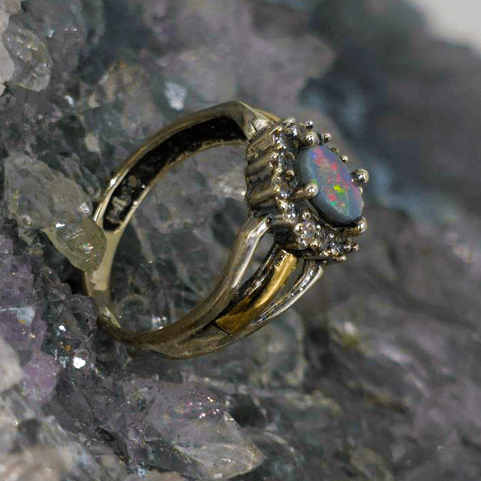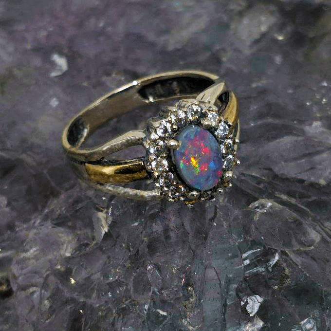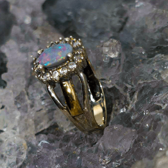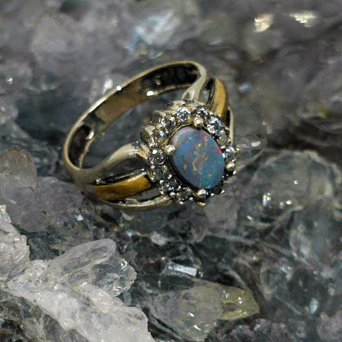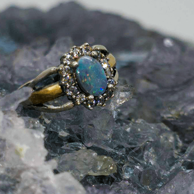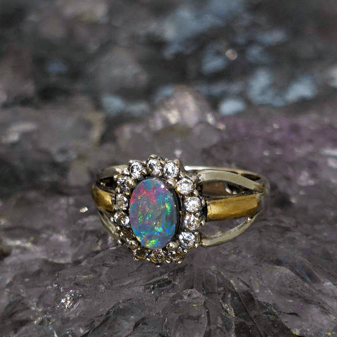Soft as a memory, radiant as dawn, Lira’tu carries the quiet magic of a voice passed down through generations—speaking now in colour. At its center glows a 0.80ct Lightning Ridge Dark Opal, alive with a full spectrum of hues—blue, green, orange, gold, pink, red, and purple—dancing across a delicate low dome. Set in a graceful mix of Sterling Silver and 9ct Gold, and accented with gentle CZ sparkle, it feels like a shimmer caught mid-song. The opal’s N5 bodytone and B3 brightness lend it a luminous depth—subtle, yet full of life. Sized US 7¼ ( AU O), the oval cut sits lightly, like a dream resting on the hand.