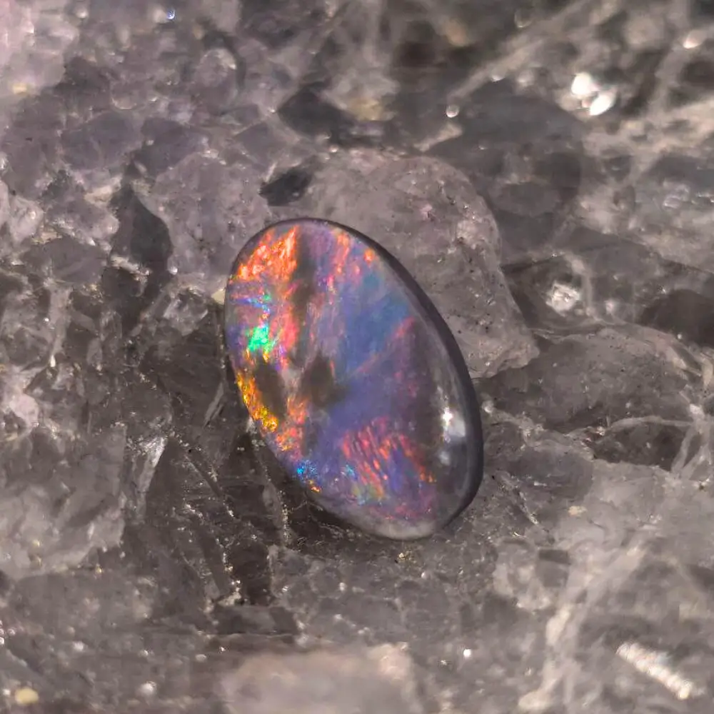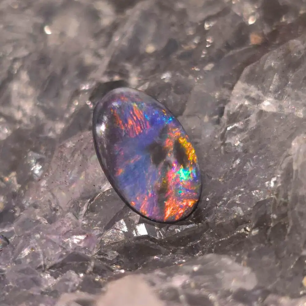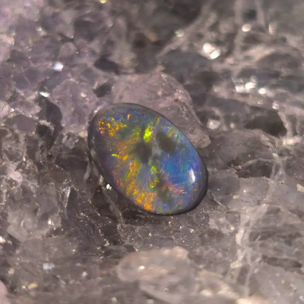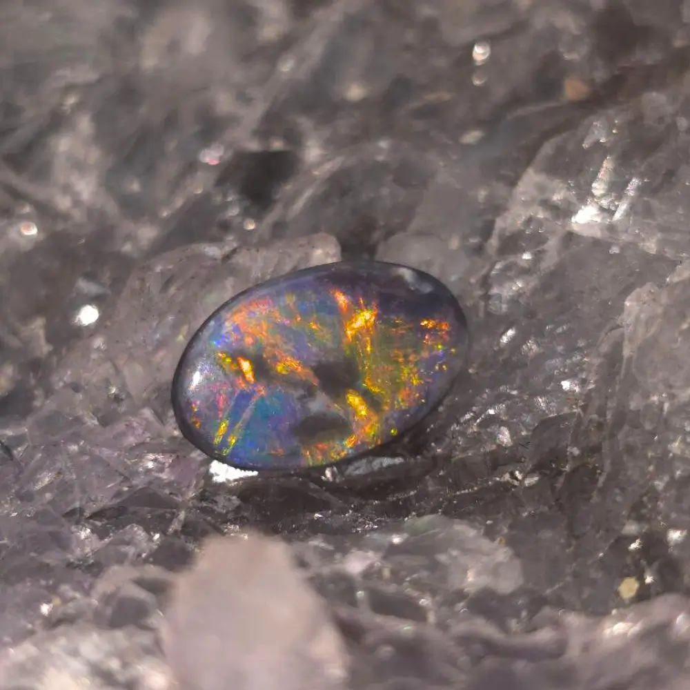 Lunareth is a captivating 1.50 ct Black Opal from Lightning Ridge, glowing with blue, green, orange, gold, pink, red, and purple hues across an N4 bodytone and B2 brightness. A radiant oval gem, shaped in a gentle low dome, holding moonlit fire and a sense of timeless elegance deep within.