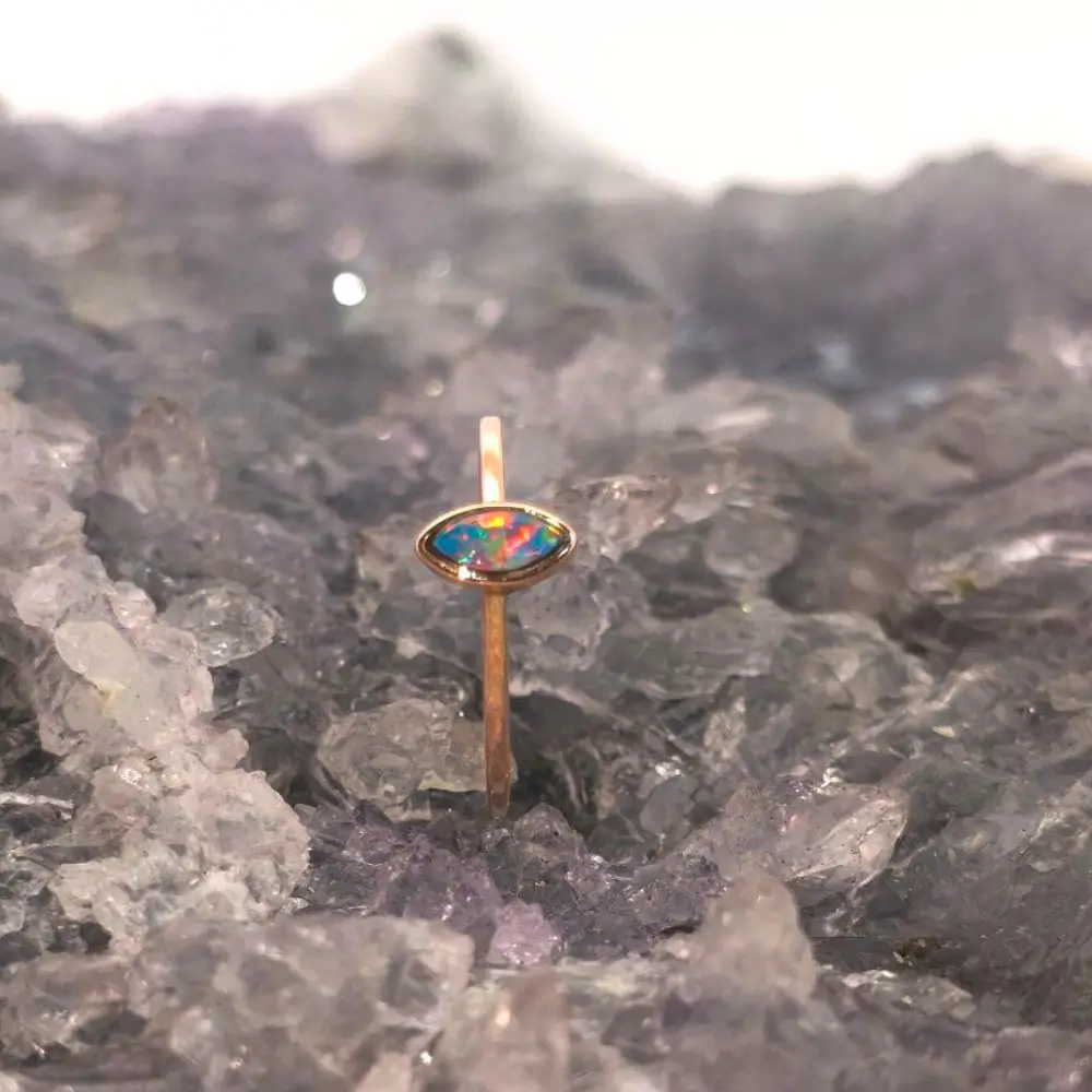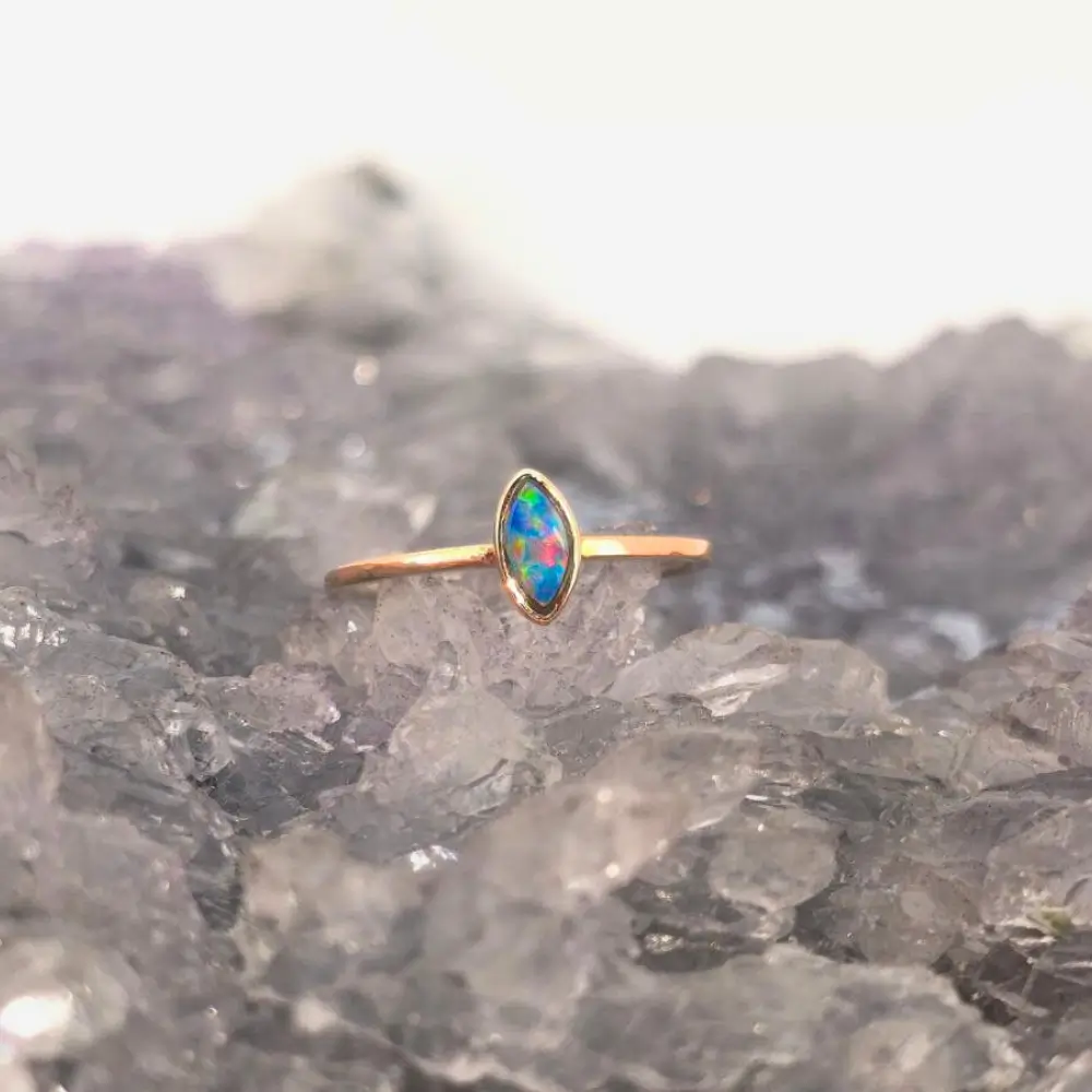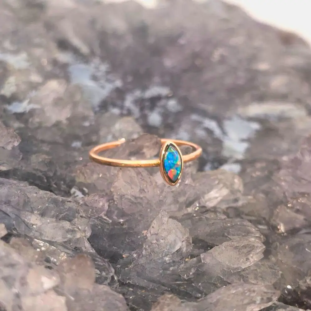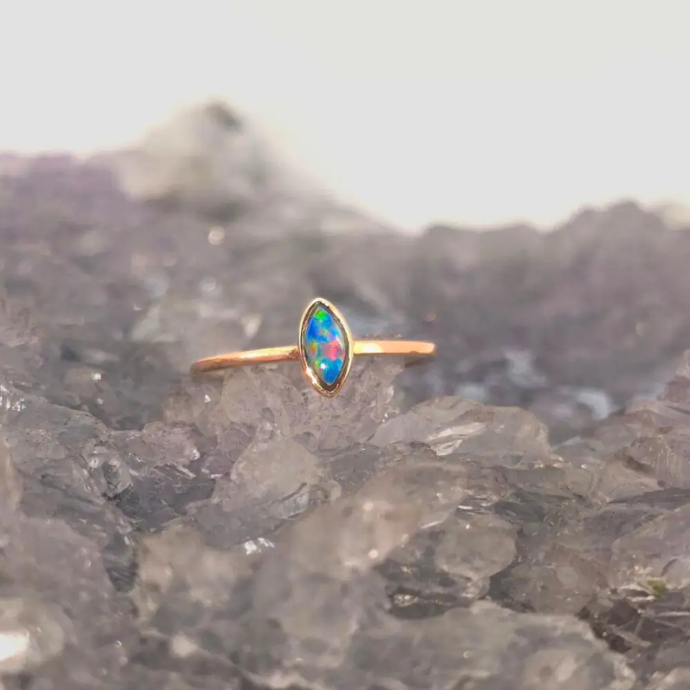 A custom-made Doublet opal 0.25ct ring from Lightning Ridge, set in warm 14K gold and crafted for effortless, lightweight wear. The 6 × 3 mm opal displays an N3 dark body tone with B4 very bright brilliance, alive with vivid flashes of blue, green, orange, gold, pink, and red that respond beautifully to movement.