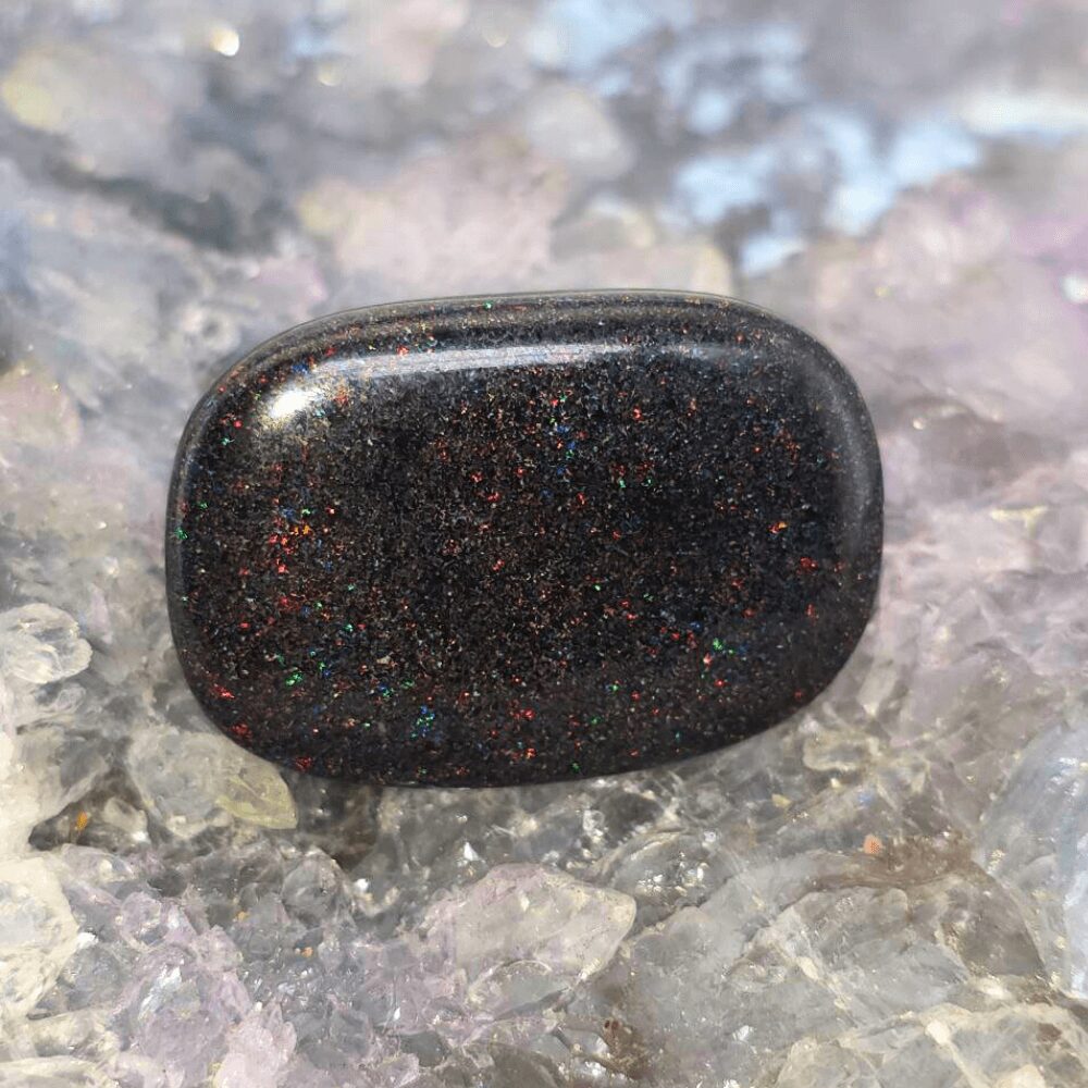 Mavako moves like memory and sound — a name born of movement and echo, evoking a deep, chant-like rhythm that stirs the soul. This 52.10ct Andamooka Matrix Opal, a composition of both weight and whisper. A treated treasure from the heart of Andamooka, South Australia’s ancient mineral basin, it carries the imprint of deep geologic time — stone etched by heat, water, and the long breath of the earth. Its freeform shape, polished to a subtle mirror, allows colour to flow like thought: blue, green, orange, gold, pink, red, and purple, each one surfacing like memory from shadow. The medium dome rises gently, like the swell of a drumbeat or a horizon mid-song, while the B3 brightness offers a steady, internal flame — not the loudest, but enduring, grounded, and resonant.