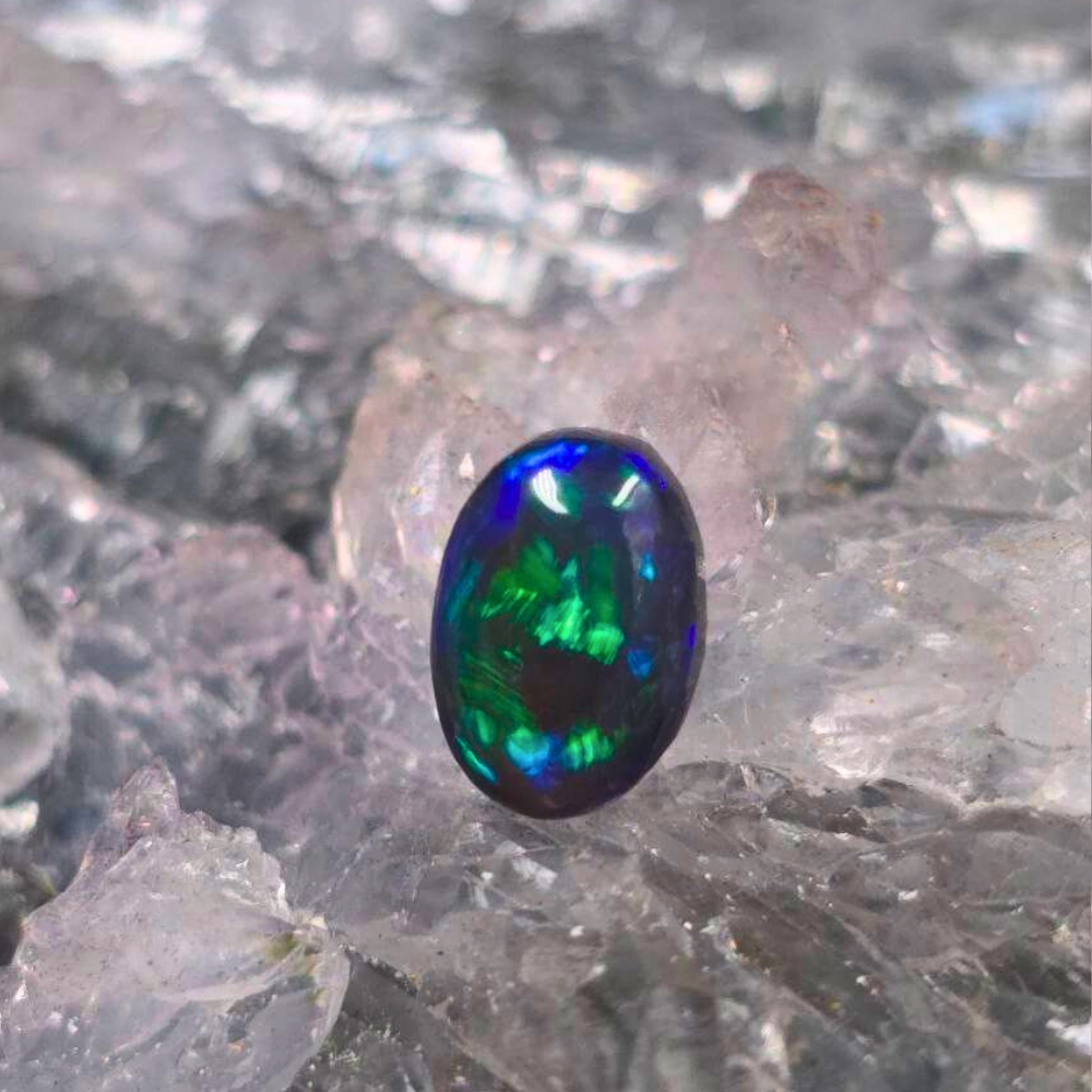 From the heart of Australia’s sacred opal country, Merindi Nullara rises—a name woven from beauty and vastness. Born of Lightning Ridge, this solid 1.95ct Black Opal is carved in a graceful freeform shape, honoring the natural flow of stone and spirit. Its surface shimmers with briliance that imitates a slightly subdued fire(B3) and enhanced with the N4 bodytone, make that blue, green, and purple hues echo twilight skies over sunlit plains. Polished to a mirror-like gleam, the opal captures light in motion—each shift revealing a hidden mood, a quiet magic. Each hue moves in fluid harmony, shifting with light and motion, mirroring the layered emotions and brilliance of its bearer. Solid and timeless, it carries the essence of resilience wrapped in elegance—an opal that doesn’t just reflect beauty, but responds to it.