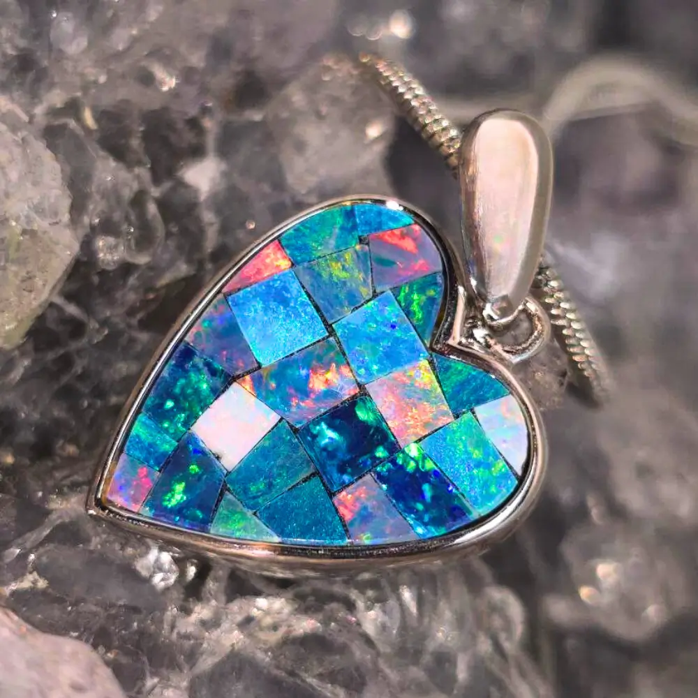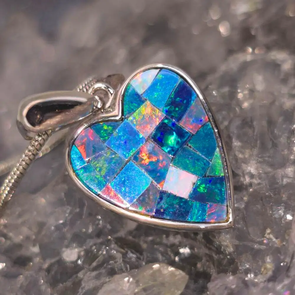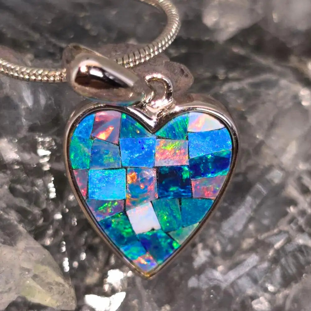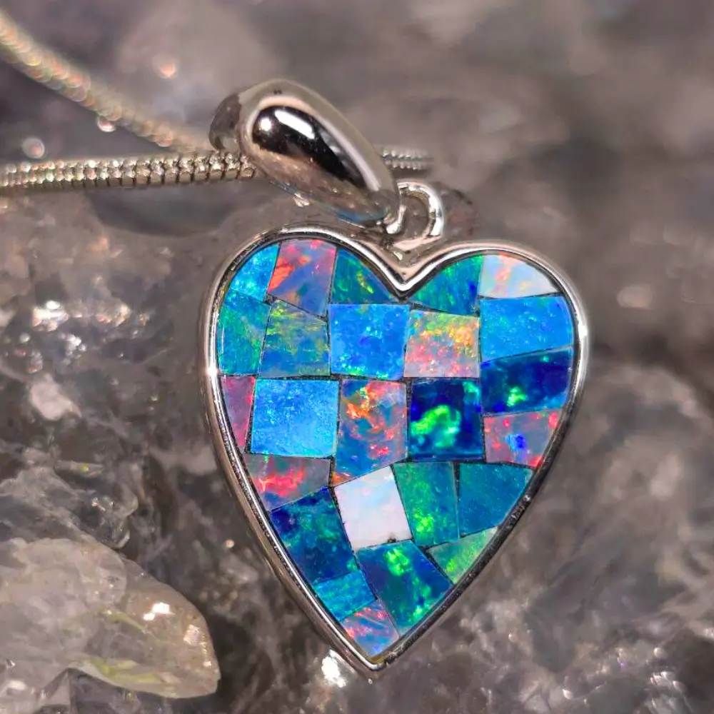 Handmade with devotion and artistic precision, ‘Mi Amour’ celebrates the vibrant spirit of youth and the wonder of life. Crafted in luminous 925 sterling silver, this heart-shaped necklace features a 3.00 ct. crafted Inlay Crystal Opal from Coober Pedy, Australia — renowned for producing some of the world’s most captivating opals.