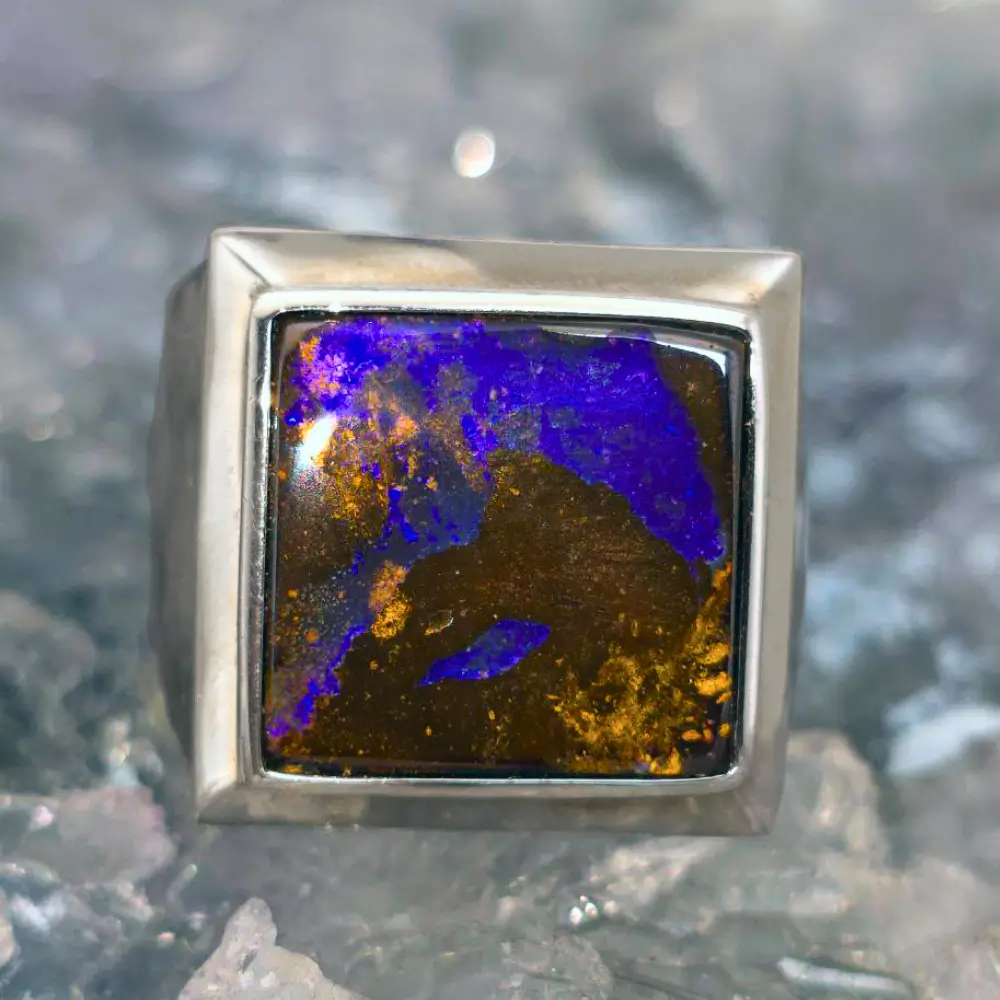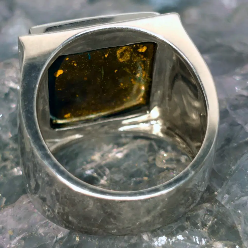 Mirrulo is more than a ring; it is a statement. Handcrafted for the man who values quiet strength and purpose, this signet embodies identity, legacy, and distinction. At its heart rests a 25.00 ct solid Queensland Boulder Opal, with a low-profile dome that accentuates its architectural presence. Its B2 flashes of blue and green across deep ironstone speak of restrained power — a controlled fire visible only to those who look closely. Set in polished 925 silver, every angle, curve, and finish is sculpted by hand, giving the signet a weight and form that is unmistakably substantial. This Signet ring is carefully shaped by hand — no two are exactly alike.
