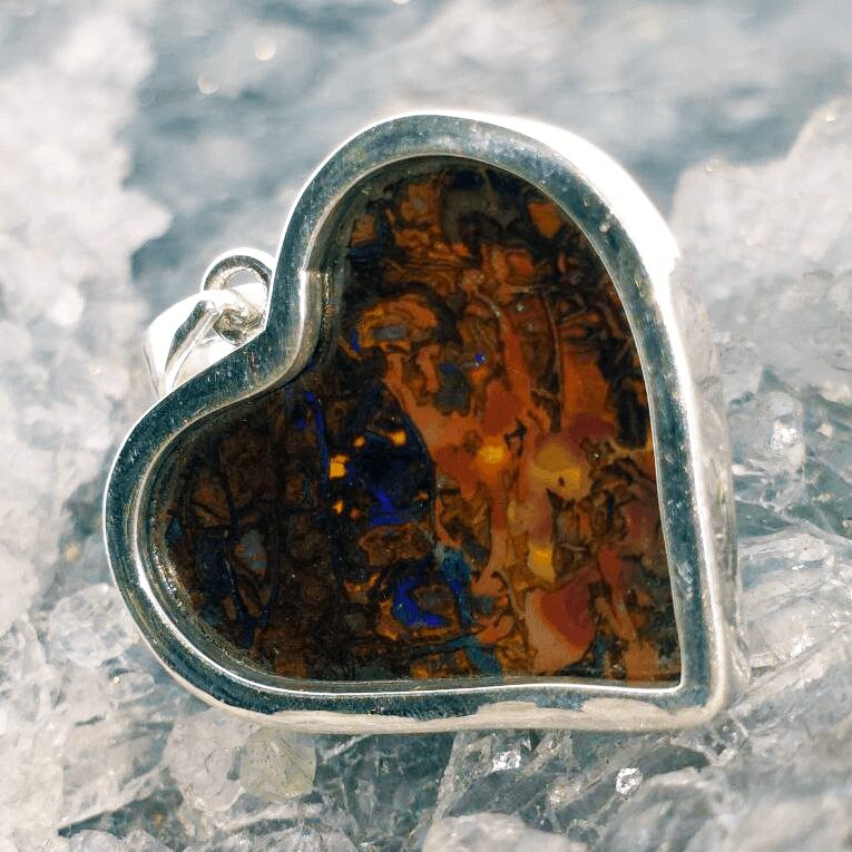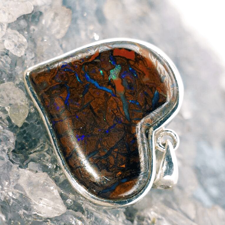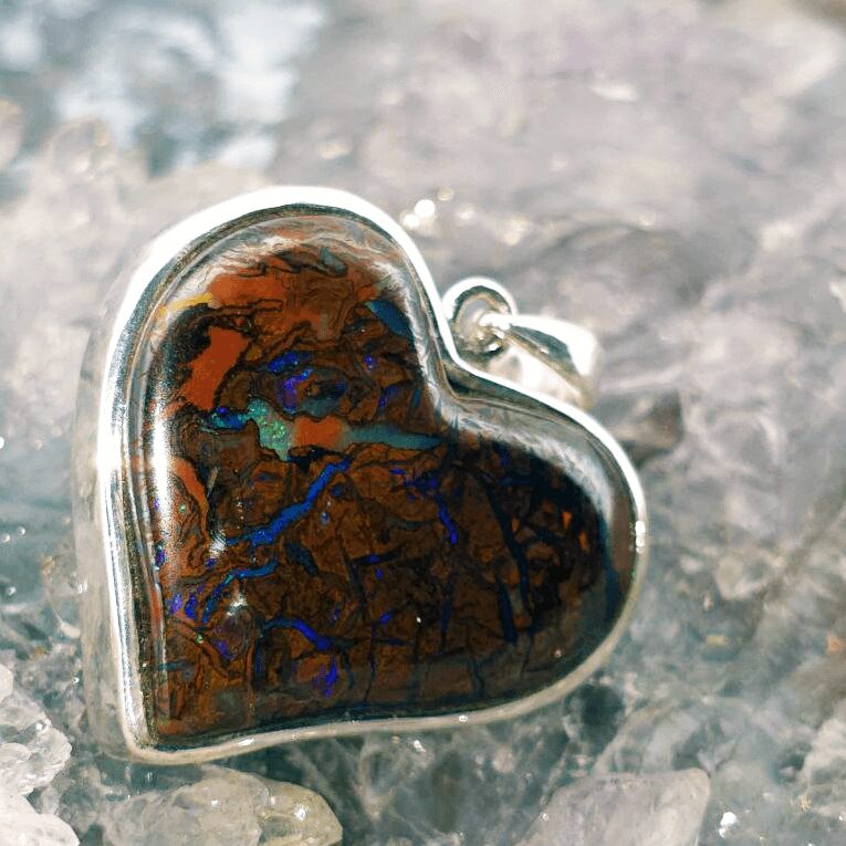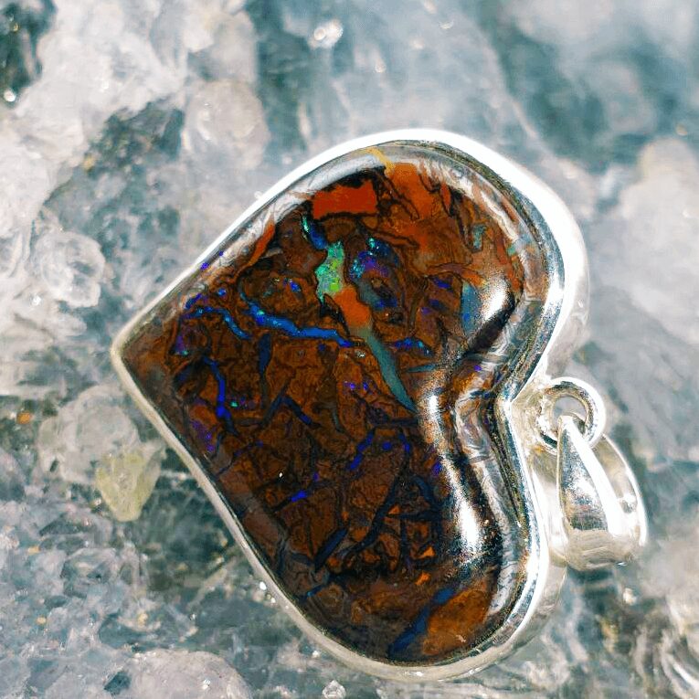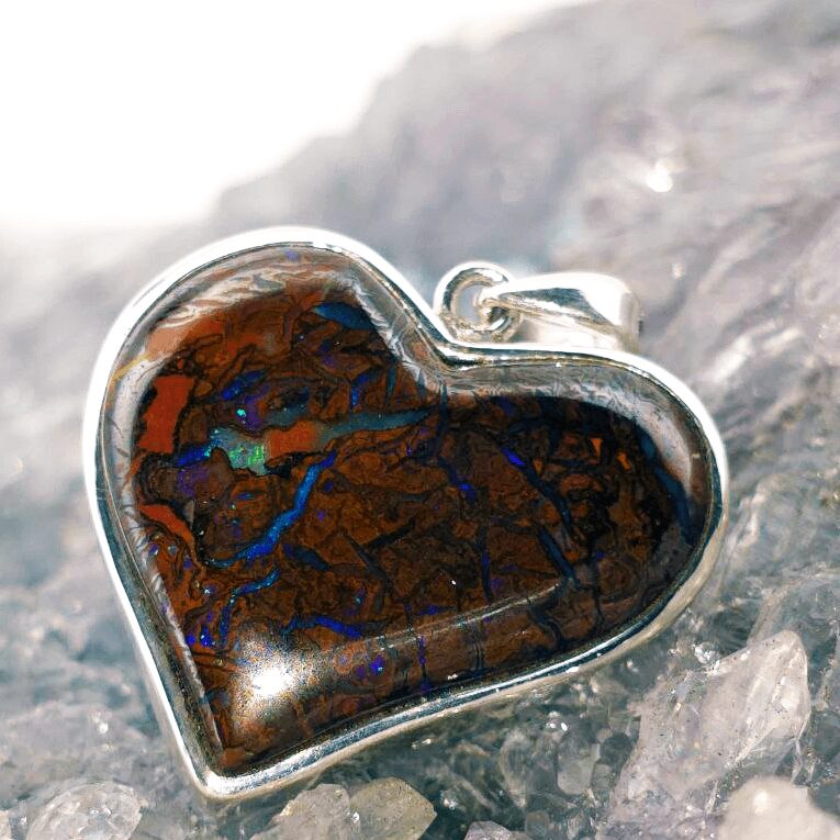 From the heart of Queensland’s ancient earth, this pendant carries the soul of the boulder opal. Shaped into a graceful heart, it holds within its polished surface shifting hues of blue, green, and purple, each flicker of light a testament to transformation and timeless beauty. Measuring approximately 30.5 x 24.3 x 6.2 mm with a medium dome, the stone is set in solid S925 sterling silver, offering both strength and elegance. With B2 brightness, its colours radiate a quiet, deep fire—an intimate connection between earth’s grounding force and the bearer’s inner light.