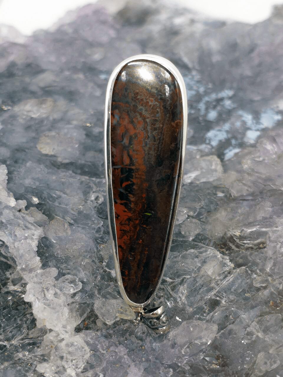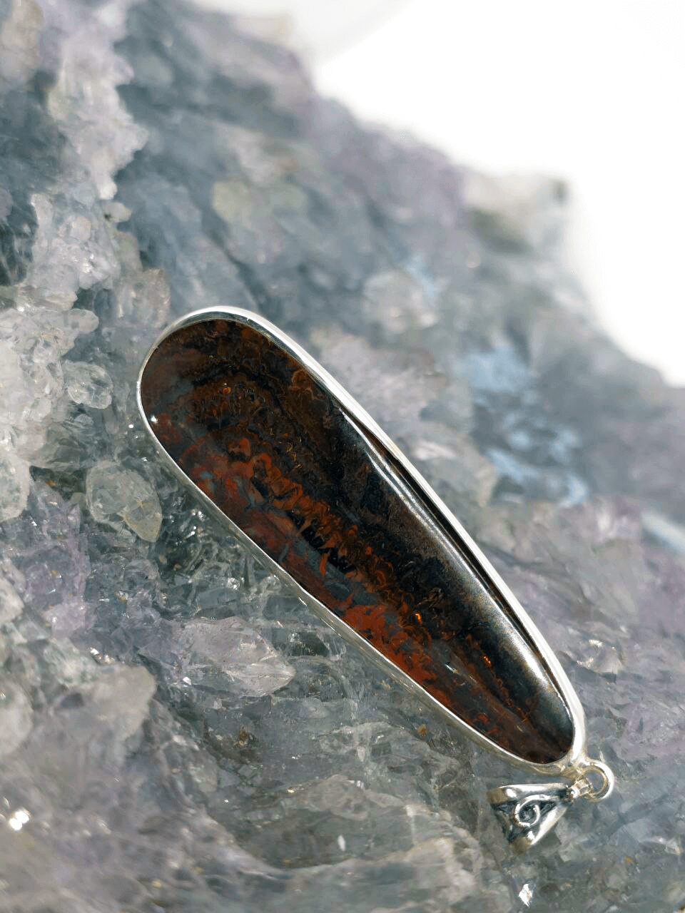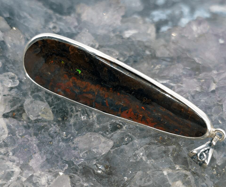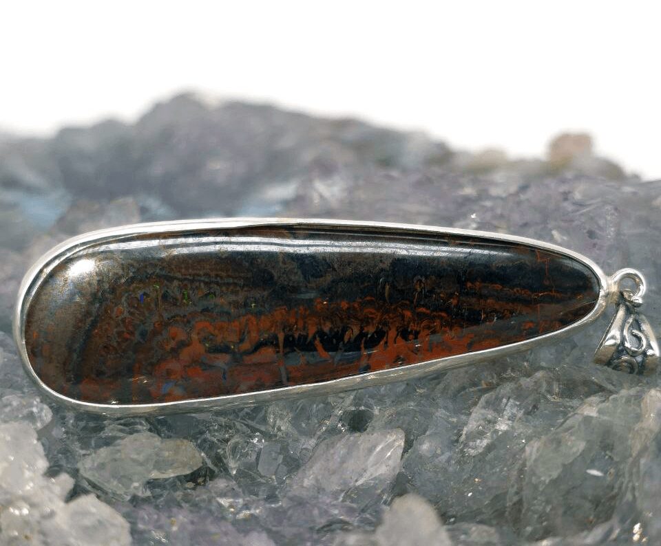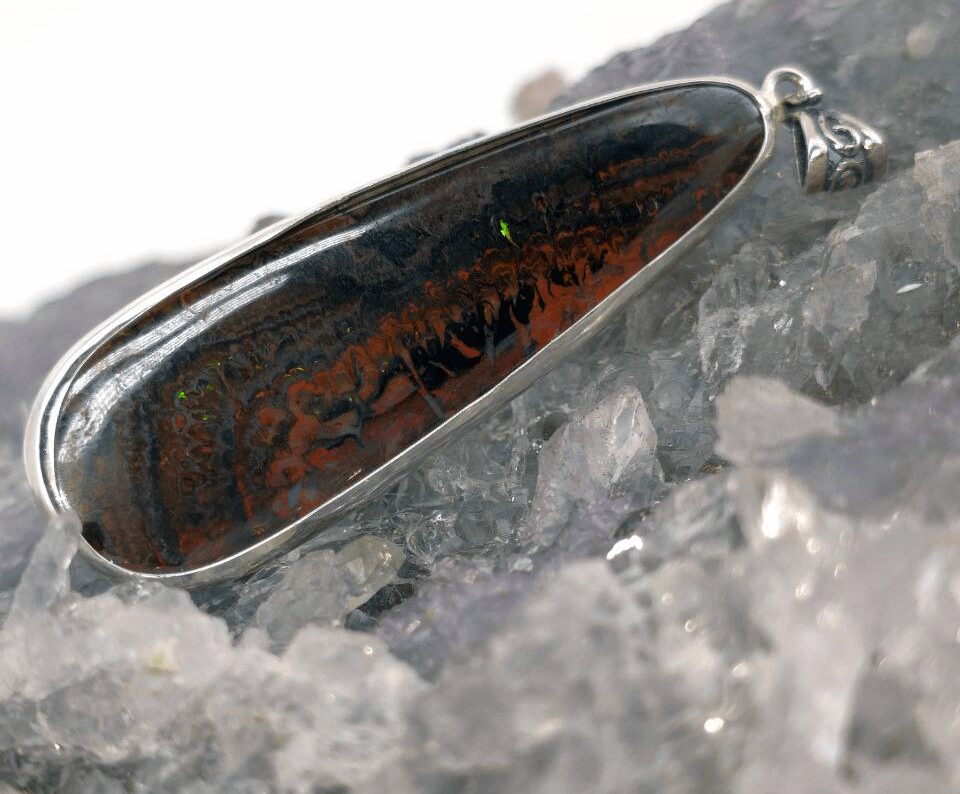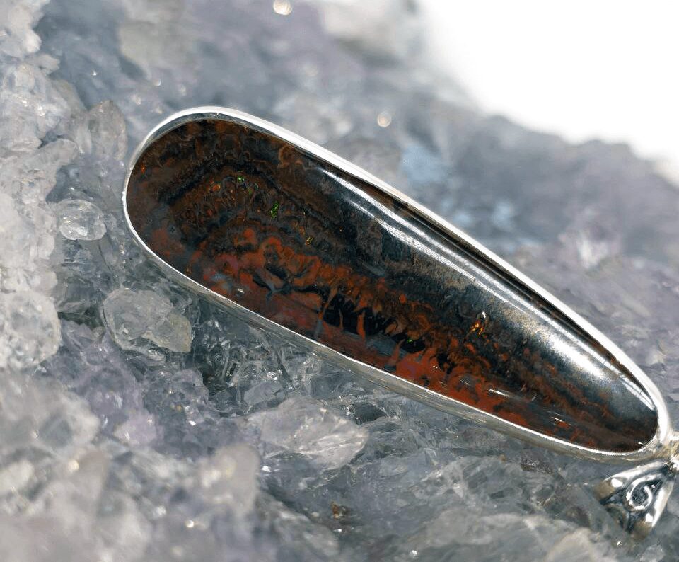From the vast, sun-etched lands of Queensland comes a talisman forged in light and stone—Noriel Elavé, a 35.00ct Boulder opal pendant hand-set in Sterling Silver. Each line, each shimmer, is a whisper from the earth, guided by the artisan’s hand and the spirit of ascent. With a low dome and a fluid freeform silhouette, this opal seems to rise from within itself—its polished surface alight with sweeping hues of blue, green, pink, red, gold, purple and orange arc across the stone like celestial signals. It is not merely a gemstone, but a symbol of movement—of stepping forward and upward, even when the path is not yet clear.