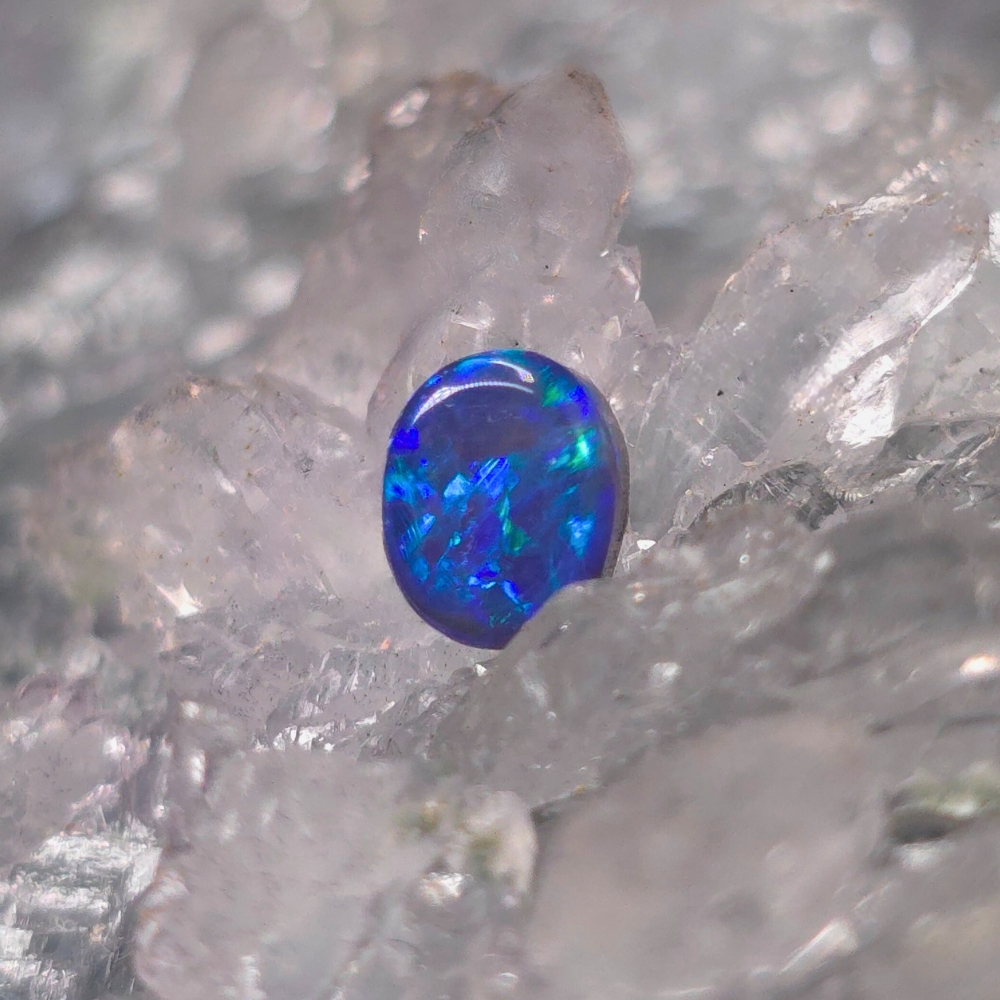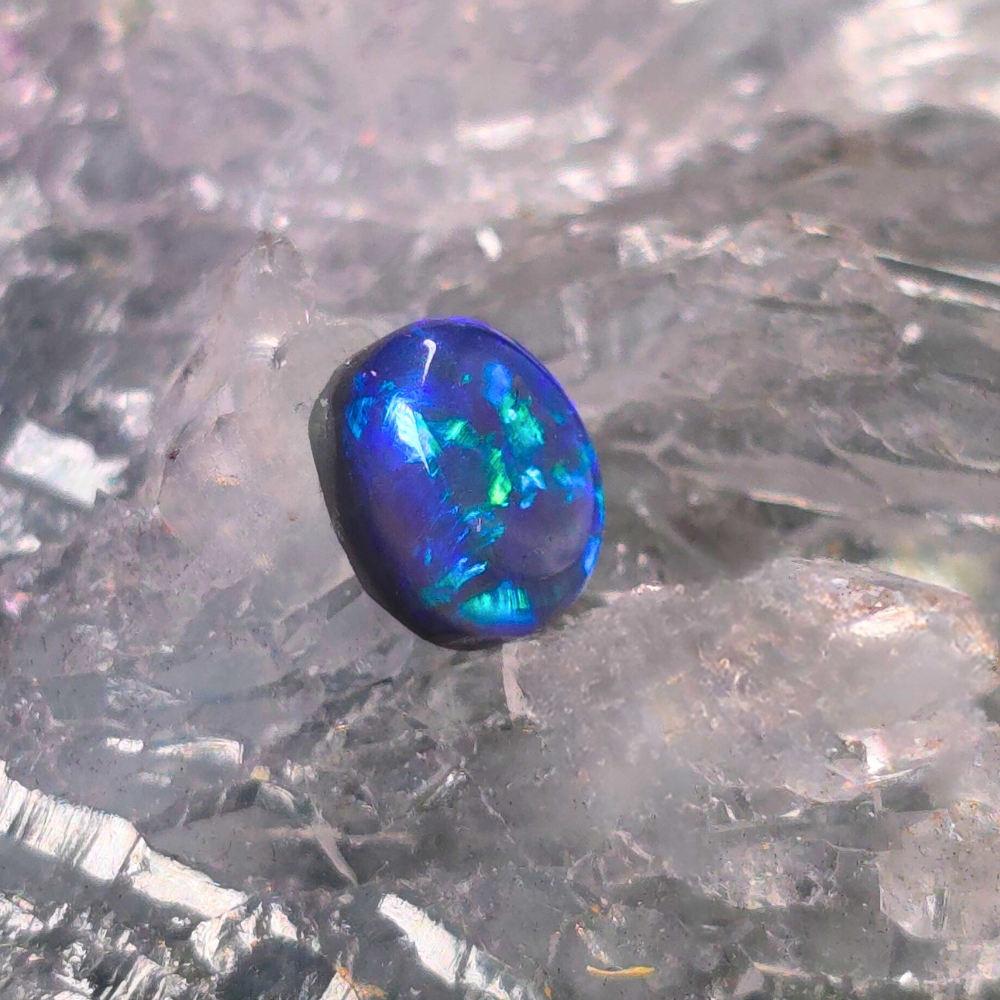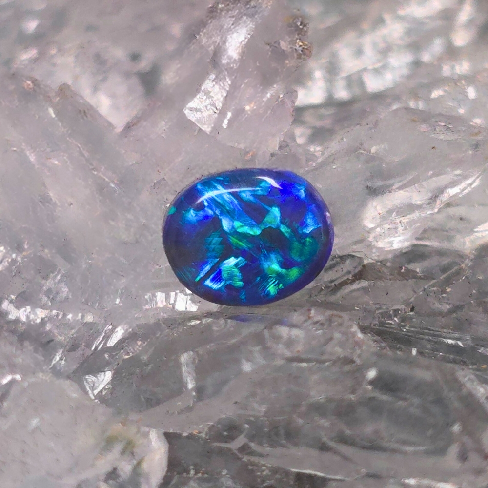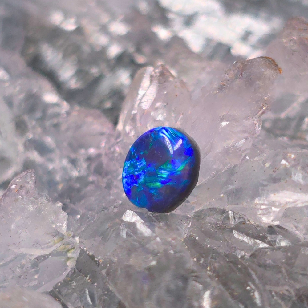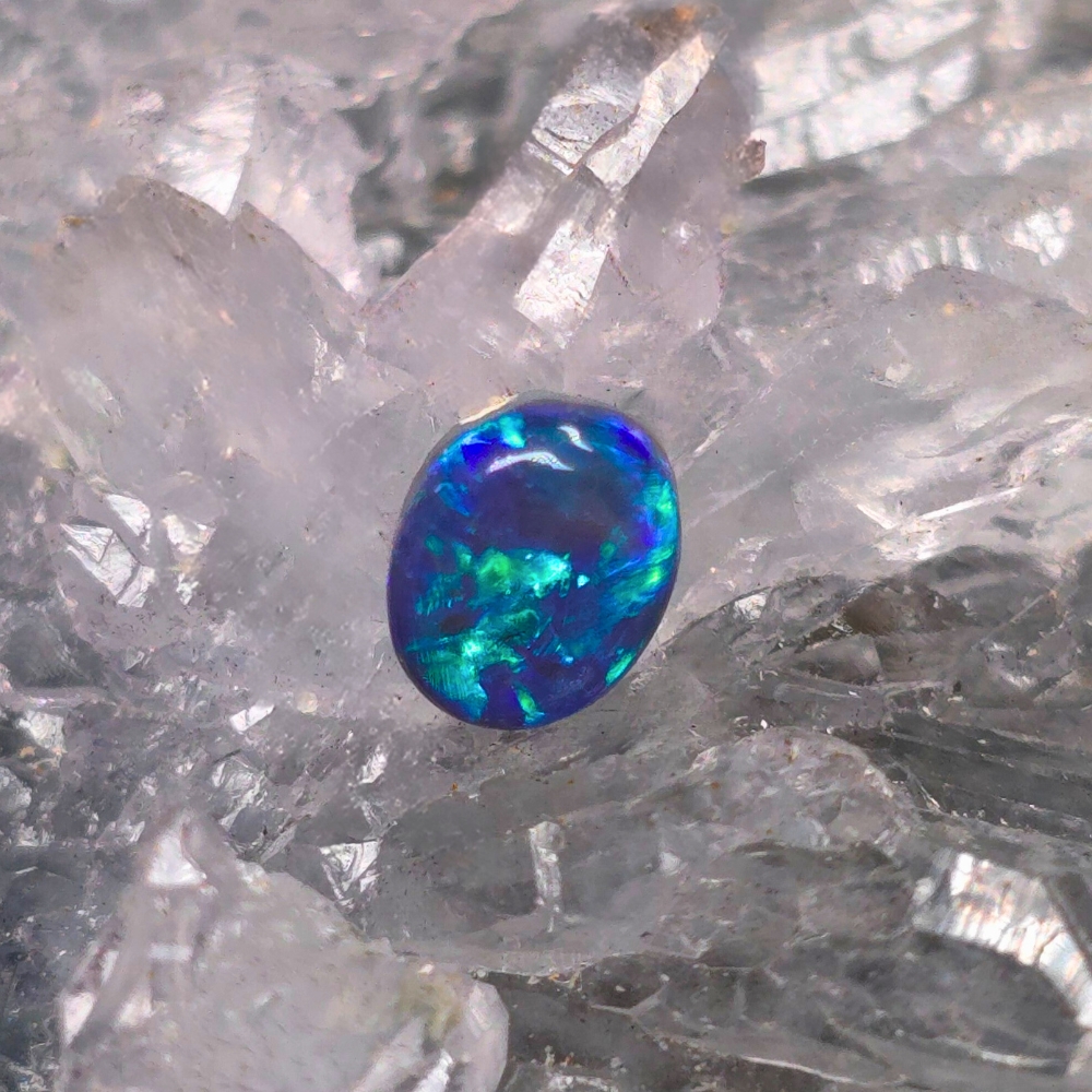 A delicate ember cradled in twilight, Novera emerges from the storied soils of Lightning Ridge with the quiet mystery of nightfall in bloom. This 0.75ct Black Opal has an Oval shape that echoes nature’s own wild design—unrestrained, fluid, its ferality beneath polished calm. With a bodytone of N3, its dark canvas is deep and whispering, while her B3 brightness hints at inner fire, flickering like a secret just beneath the surface. These make the cascade of shifting hues of blue and green unfold a secret world of colours before your eyes.