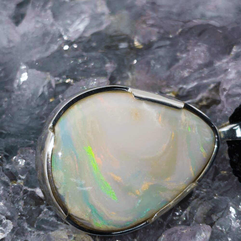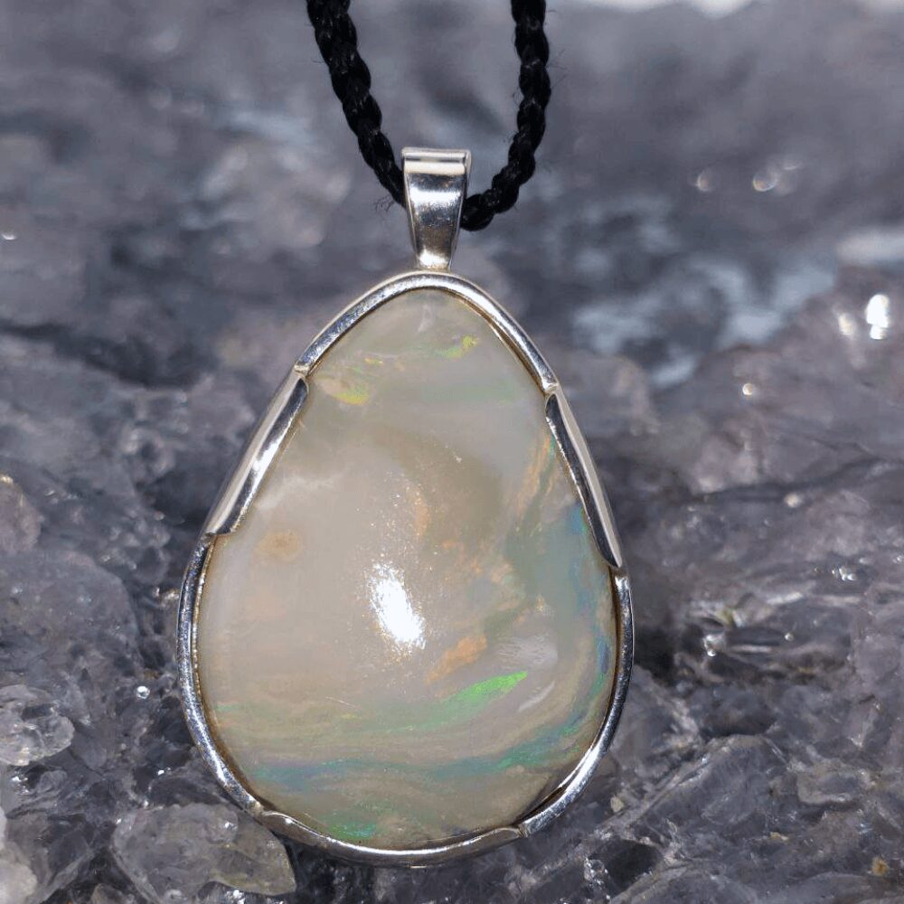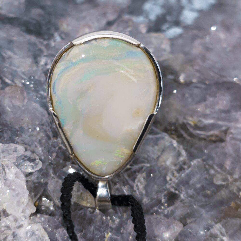 From the legendary fields of Lightning Ridge comes Amavira, a luminous 30ct white opal shaped into an elegant teardrop. Measuring approximately 29.9 x 21.8 x 6.1 mm, this opal displays an enchanting low dome with an N9 bodytone and B2 brightness. Its polished surface unveils a radiant spectrum of blue, green, orange, gold, pink, and purple, each flicker of light shifting like a dream upon water. White opals are often seen as symbols of hope and harmony, their gentle bodytone allowing the colours within to glow like hidden fire beneath snow. Set in a handcrafted Macrame adjustable braid, this necklace creates a fusion of luxury and adaptability. It can be worn matching the texture and design to any clothing. As a result, these are the pieces that feel both timeless and stylish, carrying a sense of unparalleled artistry and natural elegance.
