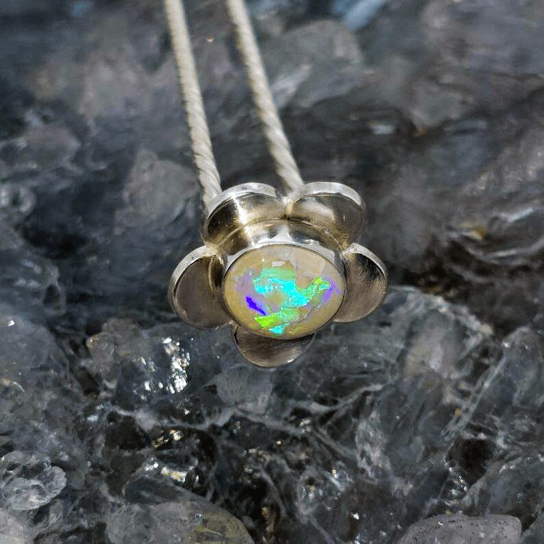 Ophelia is not just an ornament — she’s a sigh of colour caught in silver, a whisper of light woven into form. This one-of-a-kind hair pin features a natural 1.00ct solid Crystal Opal, ethically sourced from Lightning Ridge, Australia, and set delicately by hand in polished sterling silver. The opal’s oval cut and high dome give it depth and radiance, drawing the eye as it shifts through soft blue, green, and purple fire. Its translucent N9 bodytone and B2 brightness offer a dreamy, ethereal glow — subtle yet striking, like moonlight over still water.