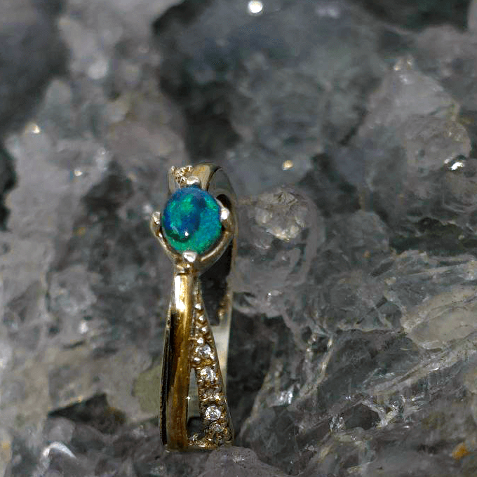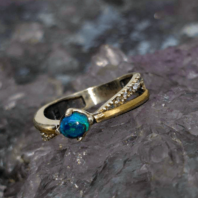 From the storied earth of Lightning Ridge—Australia’s legendary opal source—comes a gem of rare allure. Each opal from this land is singular, and Orobelle is no exception—formed over millennia, destined for one. The round-cut 0.40ct black opal, with its medium dome and B2 brilliance, glows vibrantly and carries within it the mystery of deep N4 bodytone and the magic of blue, green, and purple flames. A meeting of metals, a harmony of contrasts: Orobelle is set in a combination of 925 sterling silver and 9ct yellow gold, a union that reflects the opal’s own duality—light flickering in darkness. Delicately accented with Cubic Zirconia, the ring evokes timeless refinement while maintaining a striking contemporary edge. The silver cools, the gold warms—and between them, the opal comes alive. A ring crafted not for everyone, but for the one who walks between worlds—the best of both.