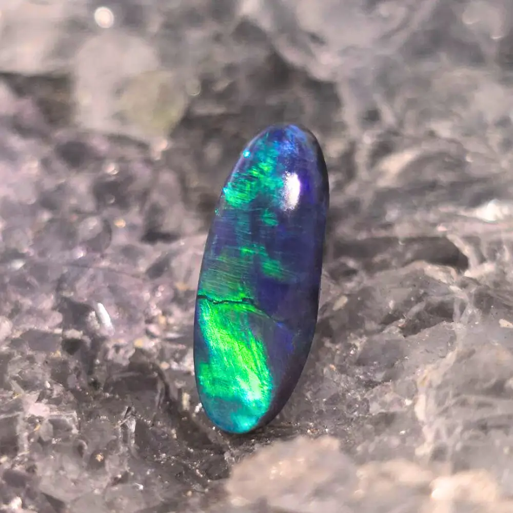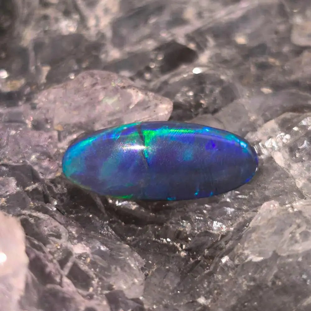 A sovereign oval Black Opal of blue and green fire, Oveil Verdantine glows with oceanic depth against its rich N3 dark body tone. With B2 moderate brightness, it reveals noticeable, living colour — balanced, refined, and effortlessly elegant. Polished to a smooth medium dome, this solid 2.70 ct gemstone maximizes colour spread while preserving its natural weight and presence. The oval shape enhances flow and elongation, making it ideal for an east–west modern setting, an eye-catching pendant or a future heirloom ring.