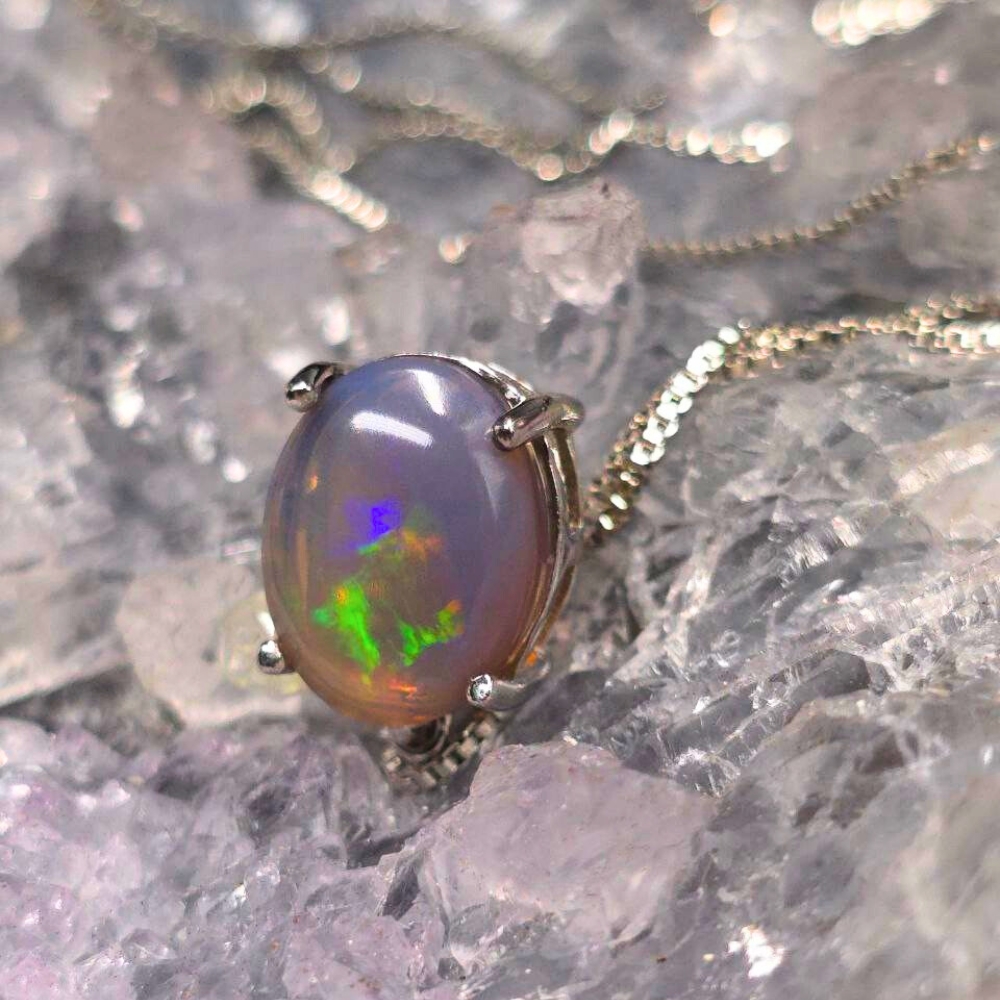 A celestial dance of shadow and light, this 4.35 Ct Dark Crystal Opal Necklace, set in 925 Silver, embodies both mystery and brilliance. Its N6 body tone holds the depth of the midnight sky (Sable), while its B2 brightness bursts like a stellar explosion (Nova), revealing fiery flashes of blue, green, orange, and gold. This precious necklace, forged in the heart of Lightning Ridge is sculpted into an elegant oval shape exuding a soft and luminous prescence.