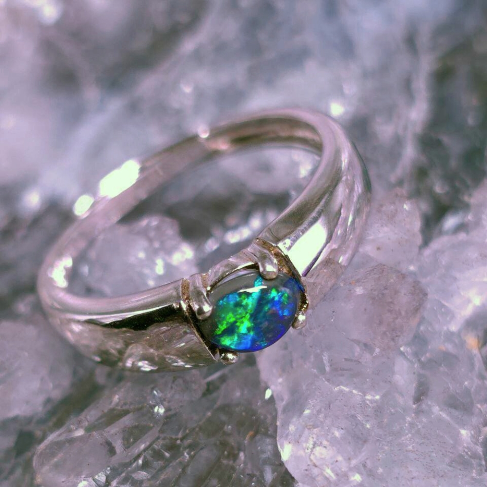 This ring is designed to rest near the energetic pathways of the hand, bringing the opal’s calming blue and heart-centered green hues into alignment with the body’s natural flow. Blue supports clarity, truth, and calm, while green inspires balance, renewal, and emotional wellbeing.