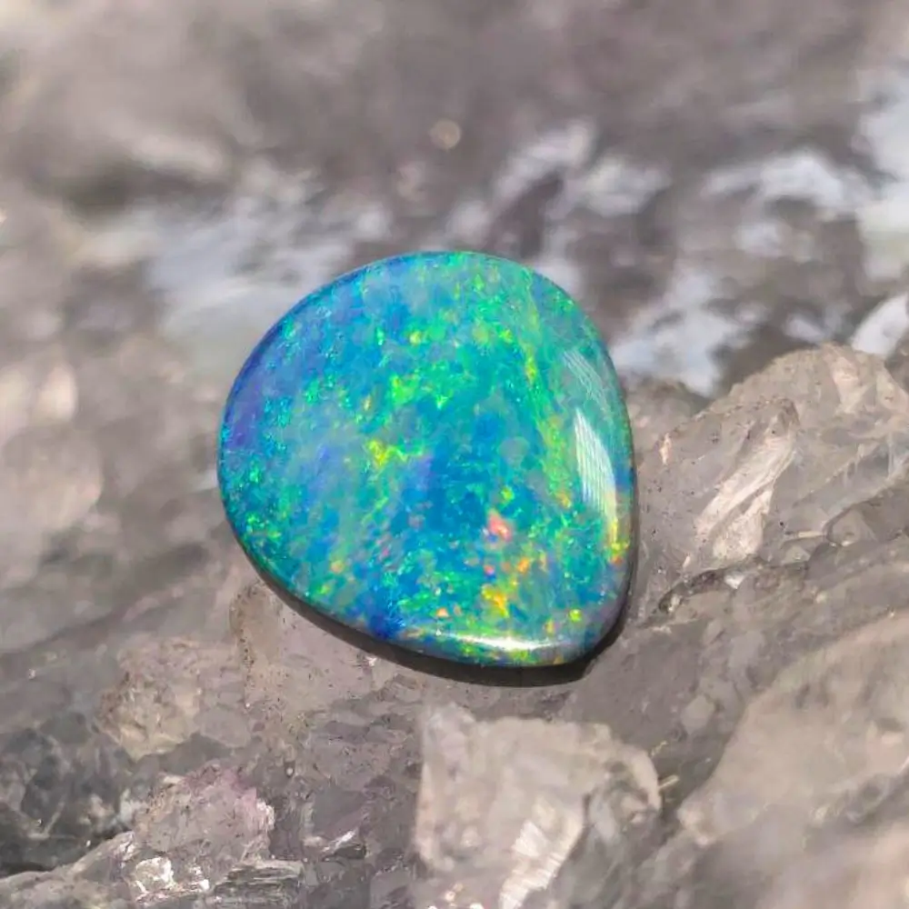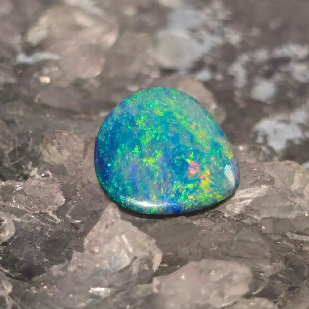 From the storied grounds of Lightning Ridge arises Sultra Glow, a 6.50ct doublet opal that carries both fire and allure. Measuring 10.3 x 8.3 x 2.9 mm, this polished oval gem with its low dome reveals a layered brilliance, where shadows and light intertwine. Its N5 bodytone and B3 brilliance forms a shimmering deep canvas, allowing colour to ignite across the surface — blue and green ripple like ocean tides, orange and gold smolder with warmth, while pink and red flare like embers kissed by breath. Each tilt of the stone releases another secret, a shimmer that teases and beckons.