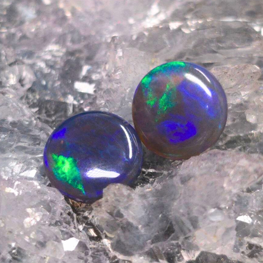 This pair of 3.30ct. Dark Crystal opals, embodies the elegance of still waters under the hypnotic glow of the moon. A moonlit whisper in opal form, its shifting hues capture the fleeting magic of dusk over water, the breath between day and night. Harvested from the legendary fields of Lightning Ridge, they reveal a mesmerizing interplay of teal, blue, green, and purple—cool-toned and mysterious, like phosphorescence on midnight tides. Set against a rich N3 bodytone, their B2 brightness evokes a soft inner radiance—a subtle, glistening light that seems to pulse from within. Their round, polished form enhances their dreamlike aura, as if they were drops of enchanted water caught in time.