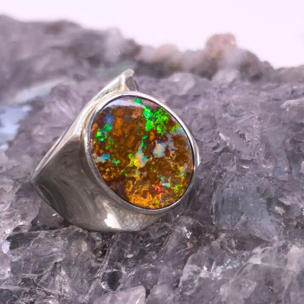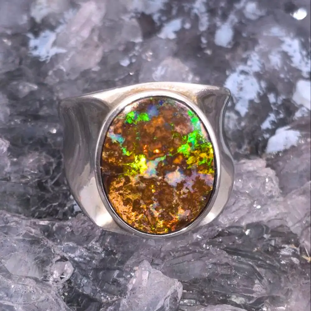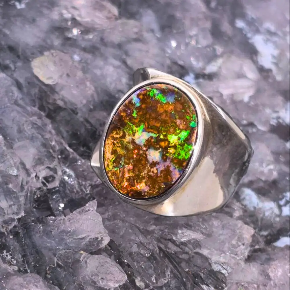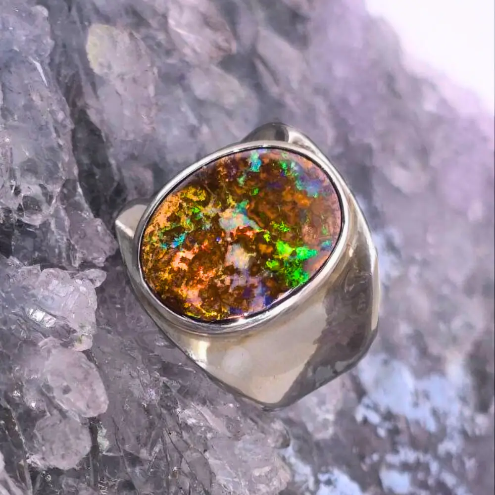 A 35.00 ct Queensland boulder opal ring, ethically sourced and polished to a low-domed oval form with B3 brilliance set in S925 silver. Its vibrant currents of blue, green, orange, gold, and red pulse like veins of energy beneath the surface. Sized at US 10 / AU T ½, this ring is crafted to sit comfortably yet command presence on the hand, designed to feel like a natural extension of the wearer’s skin.