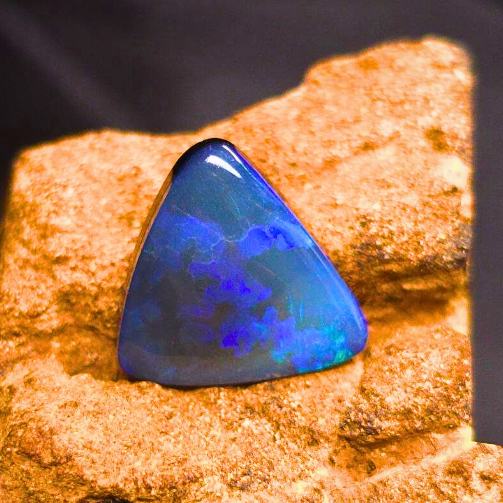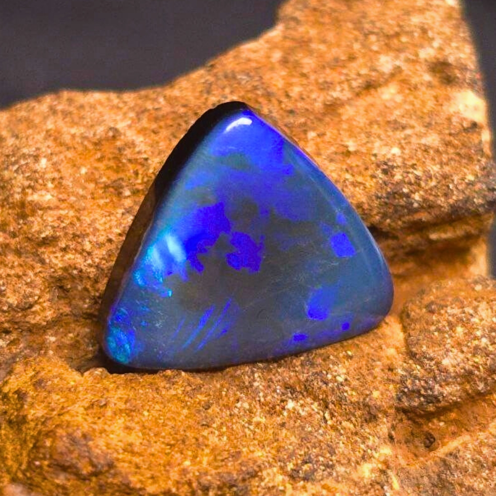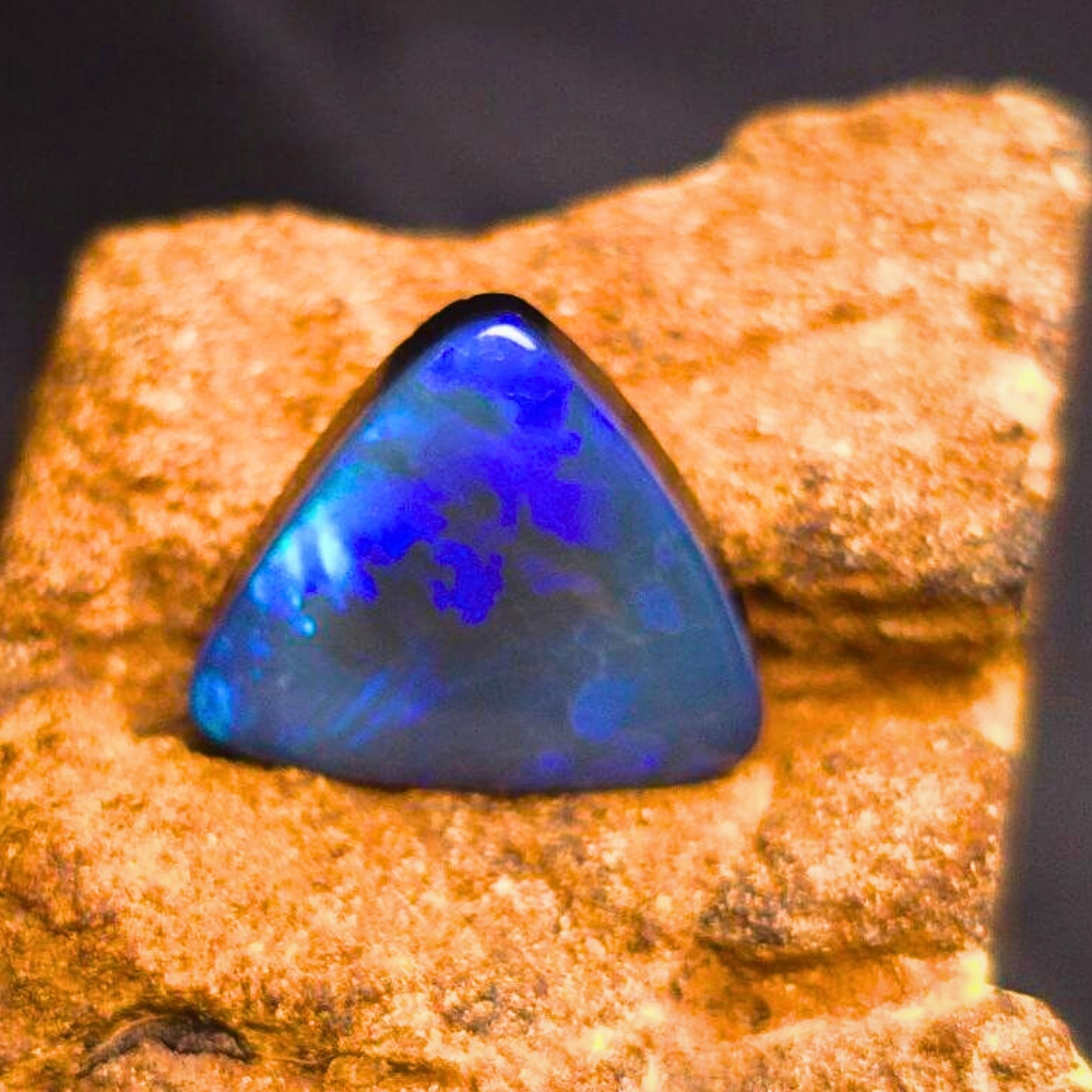 This exceptional 5.15-Carat (1.03G) doublet opal from Lightning Ridge is a polished triangular masterpiece. With an N3 body tone and B2 brightness, it displays vibrant blue and green hues that shift beautifully in the light.