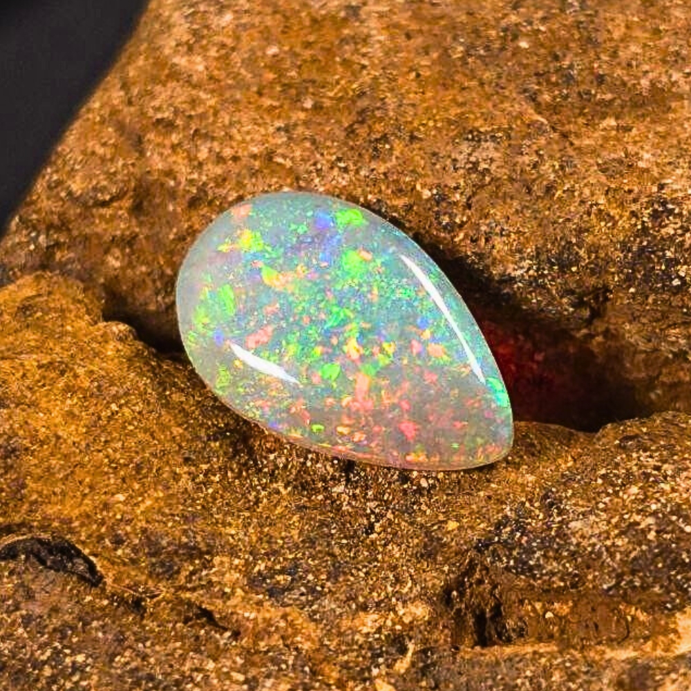 This remarkable 1.45-Carat tear-drop-shaped crystal is a radiant example of Coober Pedy’s finest opals. With an N8 body tone, it displays a delicate, light base that enhances its ethereal quality. The B3 brightness ensures a lively play-of-colour, with its polished surface shimmering in a mesmerizing spectrum of hues—vivid blue, lush green, fiery orange, radiant gold, royal purple, and soft pink. The solid pattern accentuates the opal’s natural brilliance, creating a stunning interplay of light and colour. Its medium size and tear-drop shape exude elegance, making it perfect as a centerpiece in jewelry or a prized addition to any collection