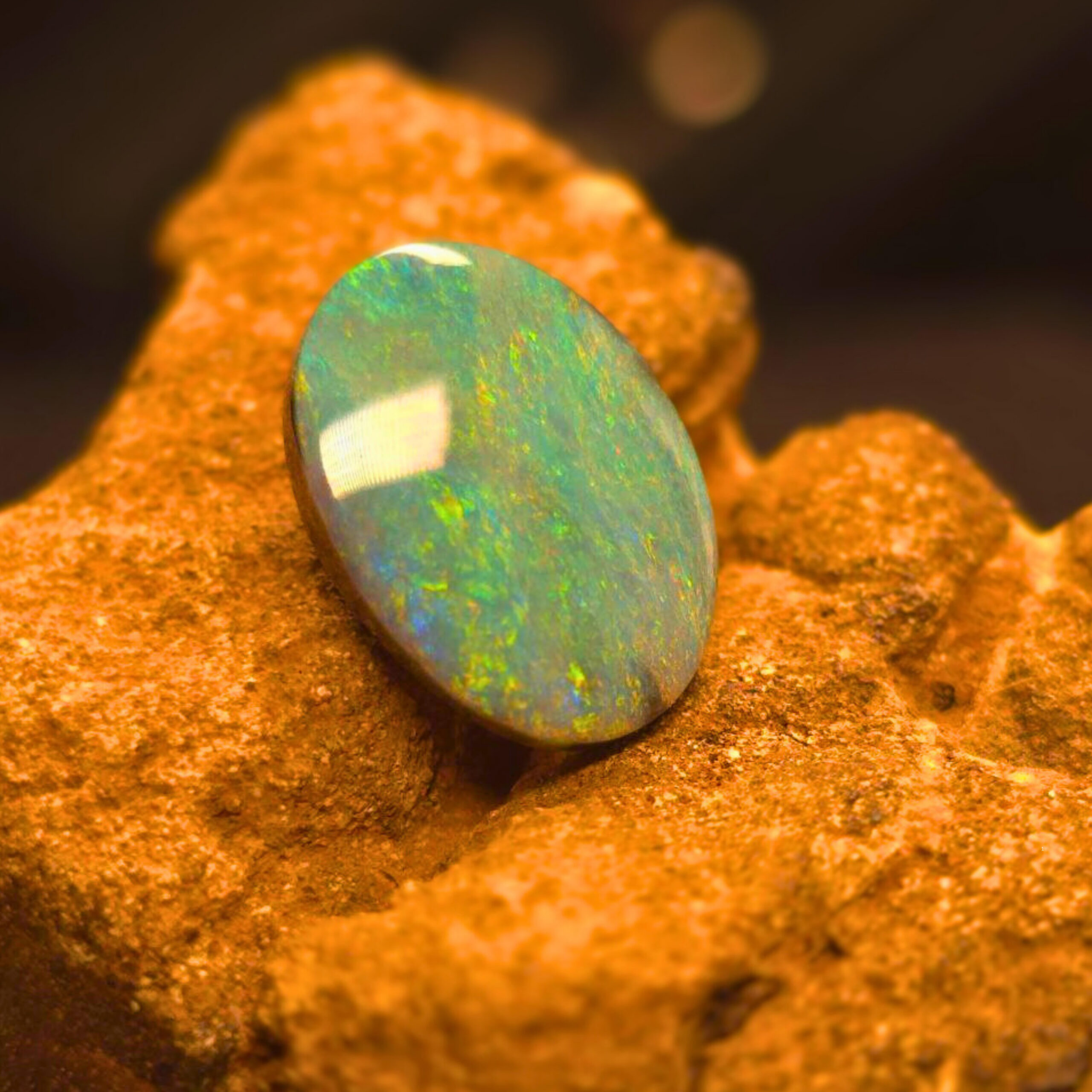 This exquisite 3.05 Ct dark opal from the renowned Lightning Ridge is a masterpiece of natural artistry. Its polished oval shape showcases an N6 body tone and B3 brightness that captivate the eye. A symphony of vibrant hues—blue, green, orange, gold, purple, pink, and red—shimmer and shift in a low yet enchanting play of colour, reminiscent of a twilight sky lit with dancing flames. Solid and timeless, this opal is a stunning testament to nature’s ability to create beauty beyond imagination, making it a perfect centerpiece for jewelry that celebrates feminine strength, elegance, and allure.