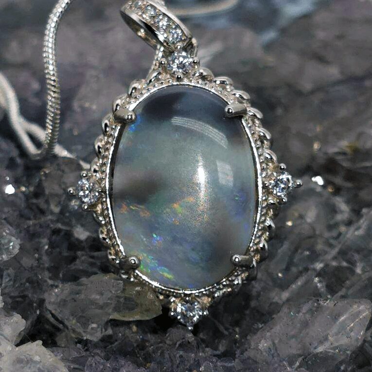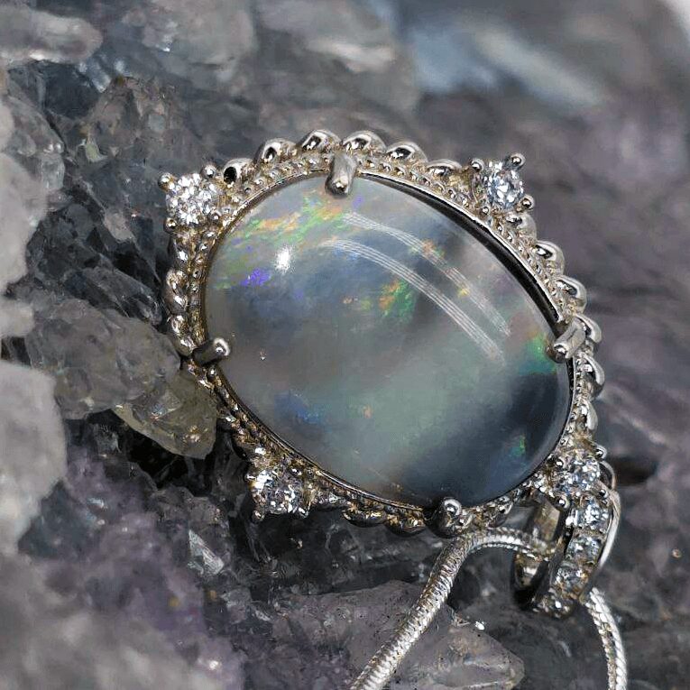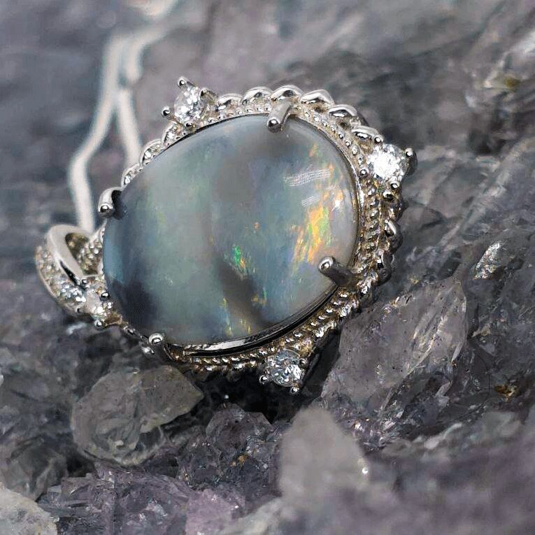 A twilight base that enhances the opal’s inner fire, giving contrast to its vibrant colours and a moodier, more enigmatic glow. -